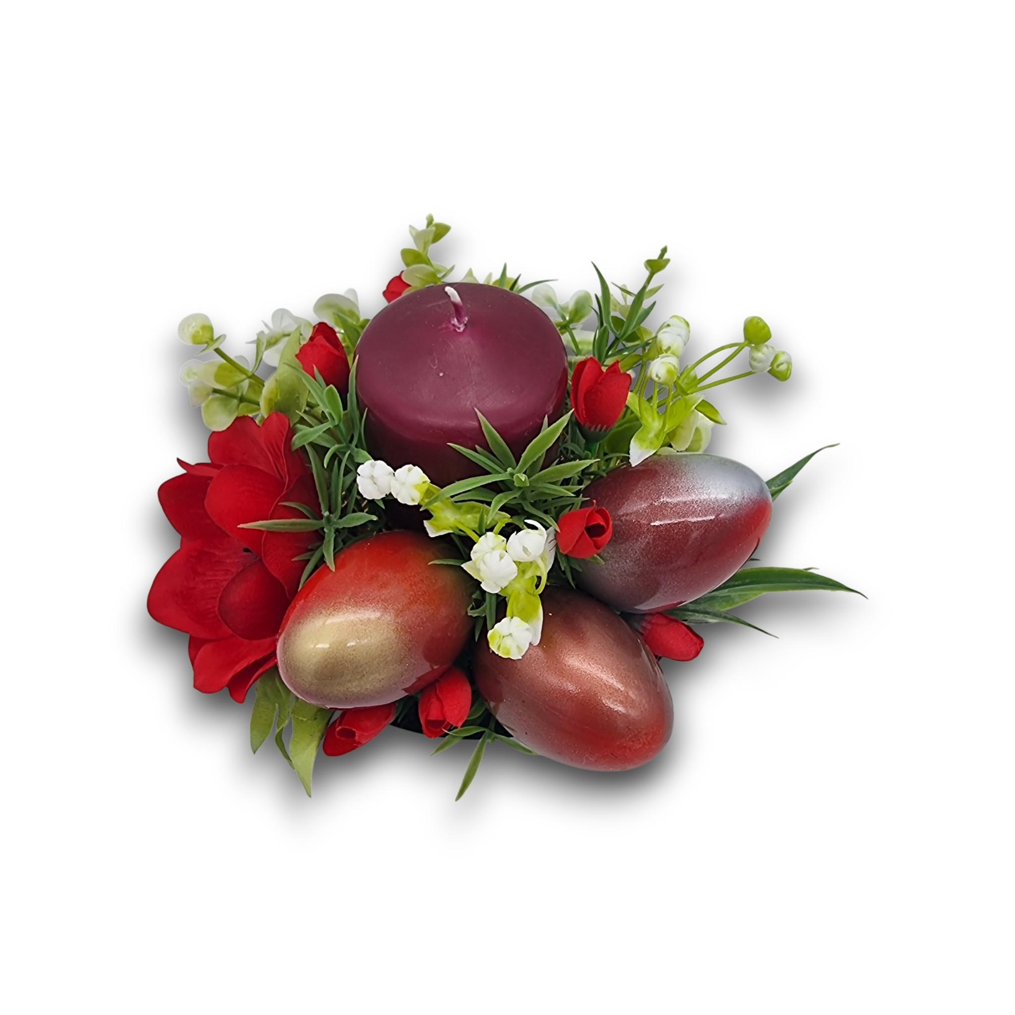 Detalii Tradiționale: Setul include ouă din plastic vopsite și lăcuite, în nuanțe de roșu și grena cu accente aurii, simbolizând tradiția Pascală într-o manieră modernă.