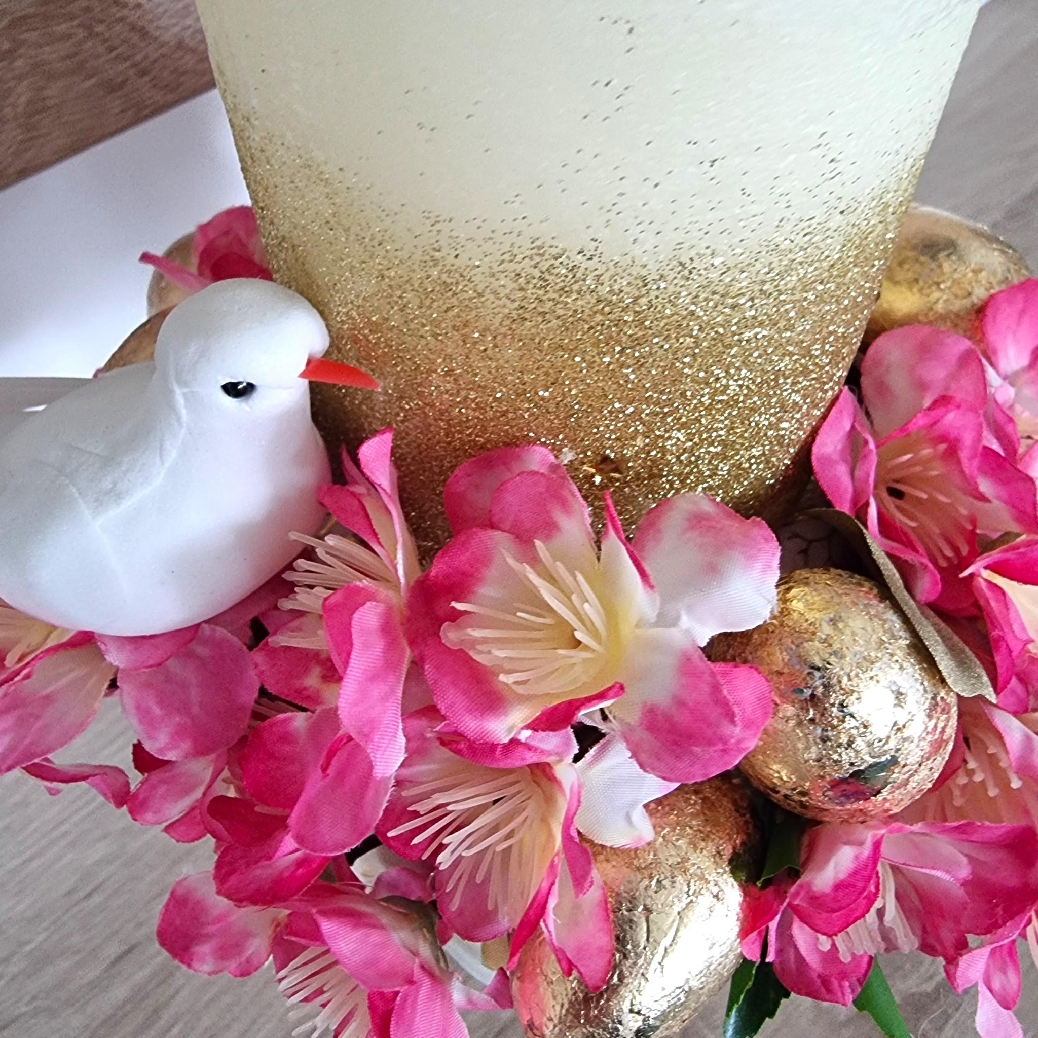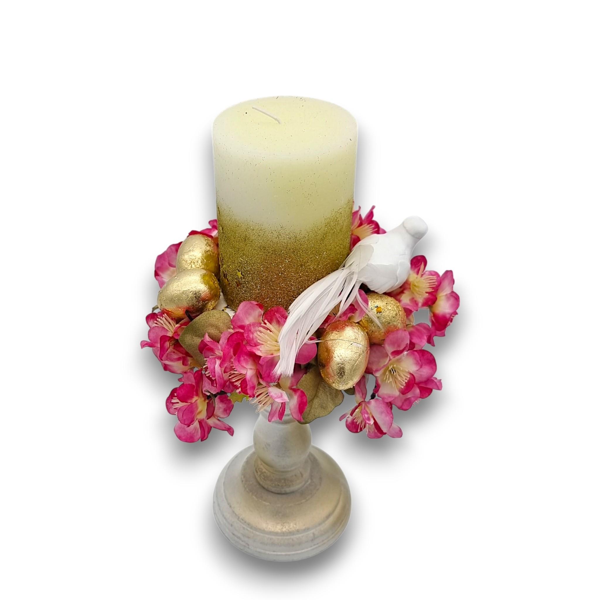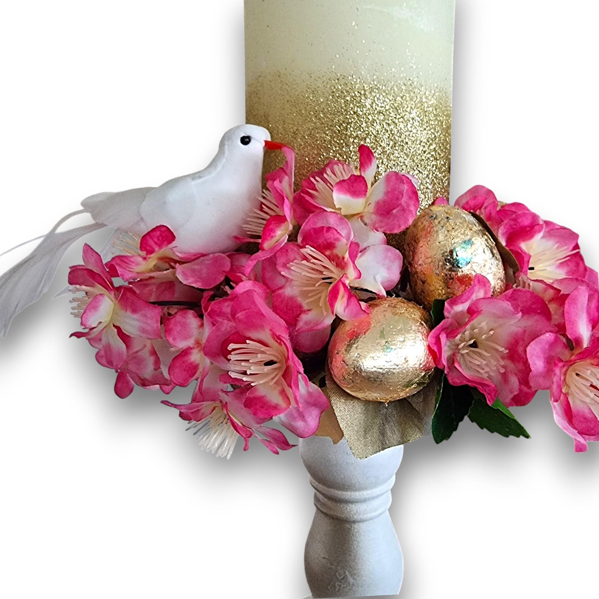 Aranjament de Paște cu Lumânare înaltă, 30 cm, Aurie – cu Flori de Cireș și Simboluri Pascale cm