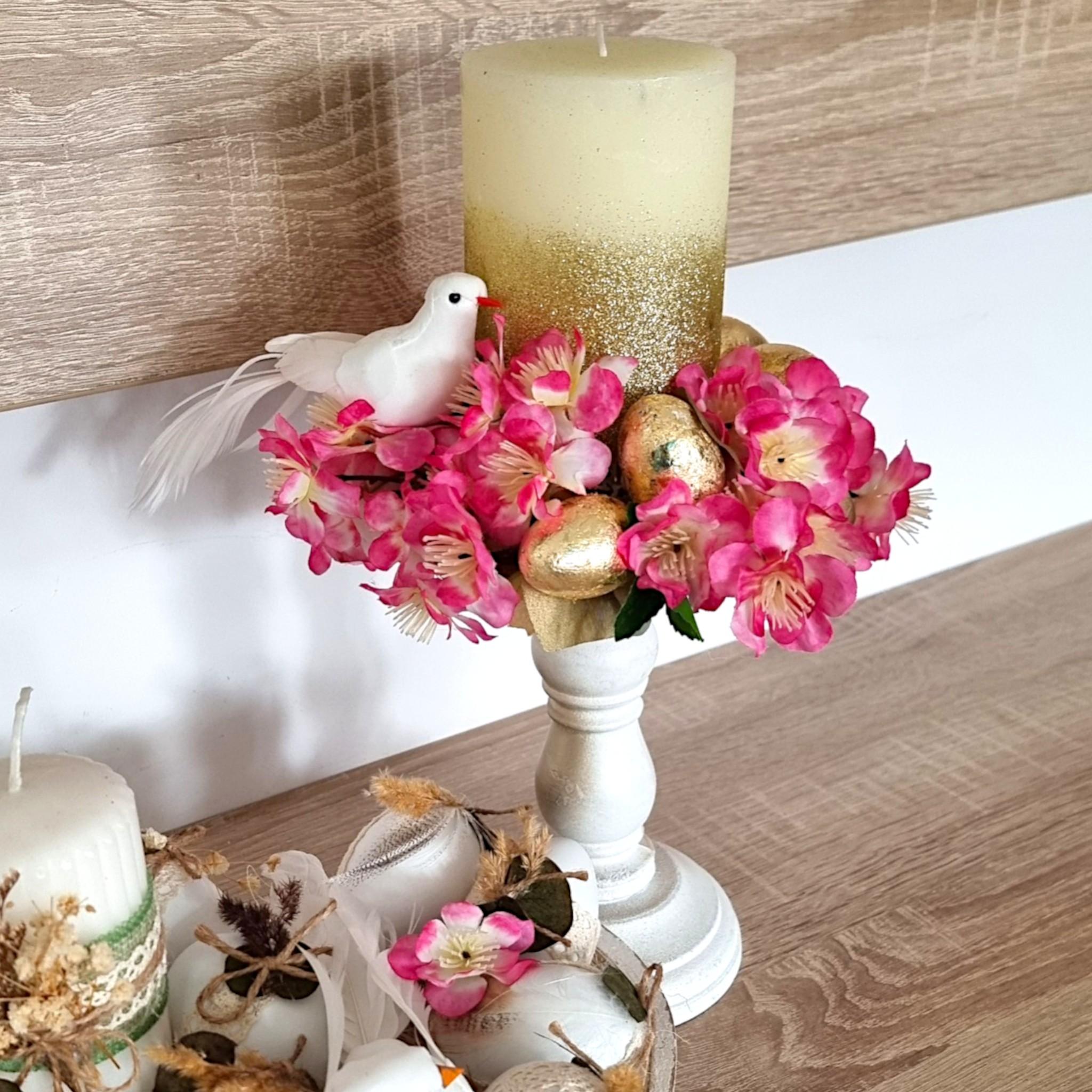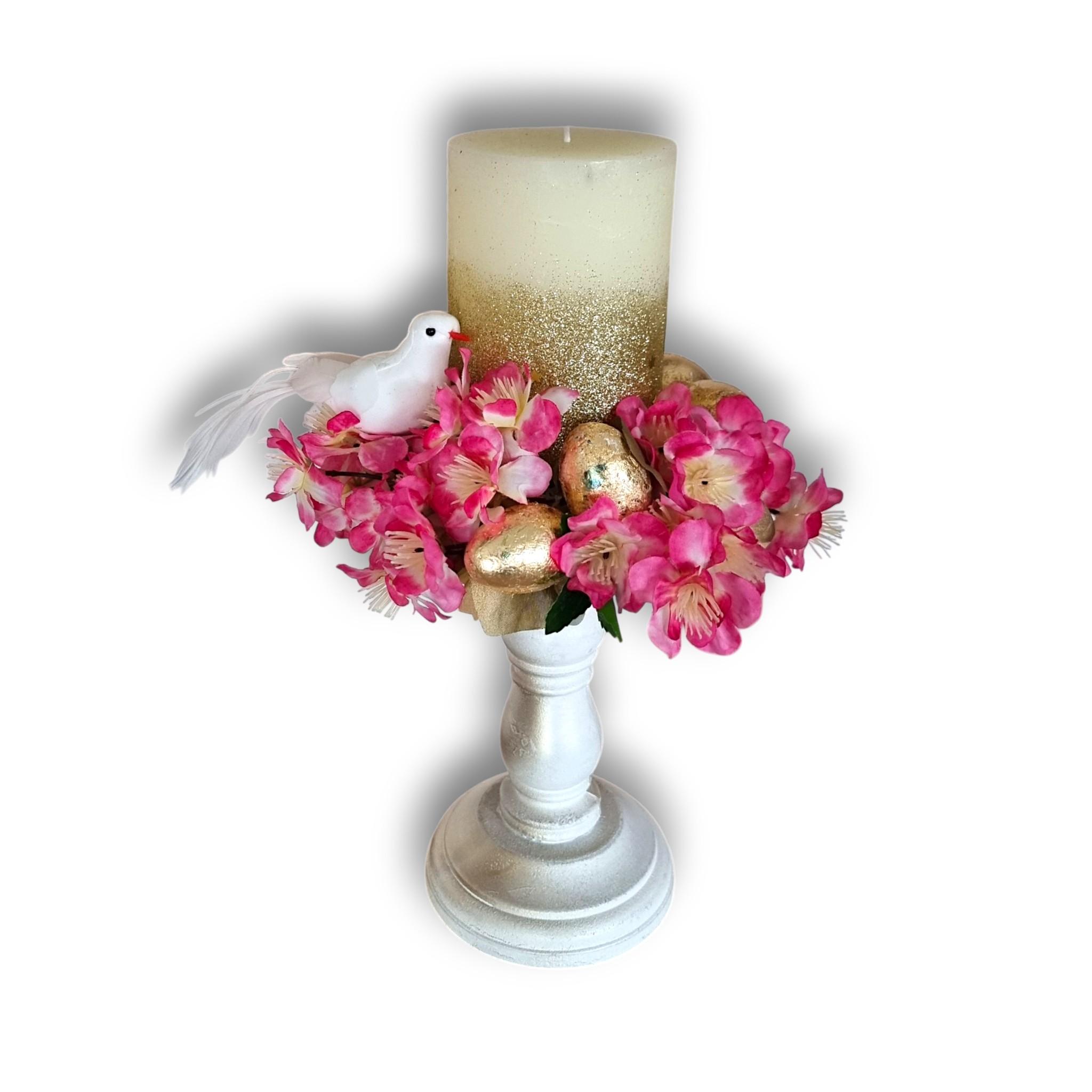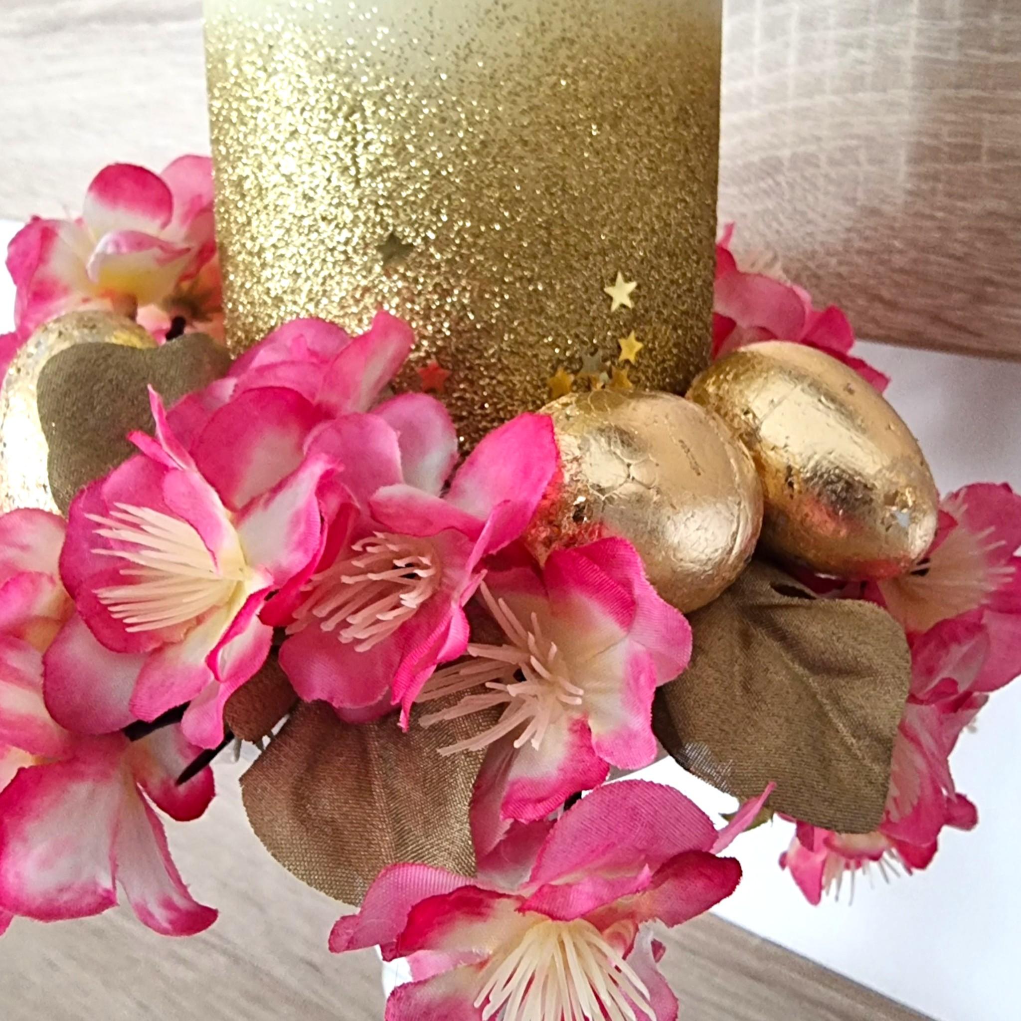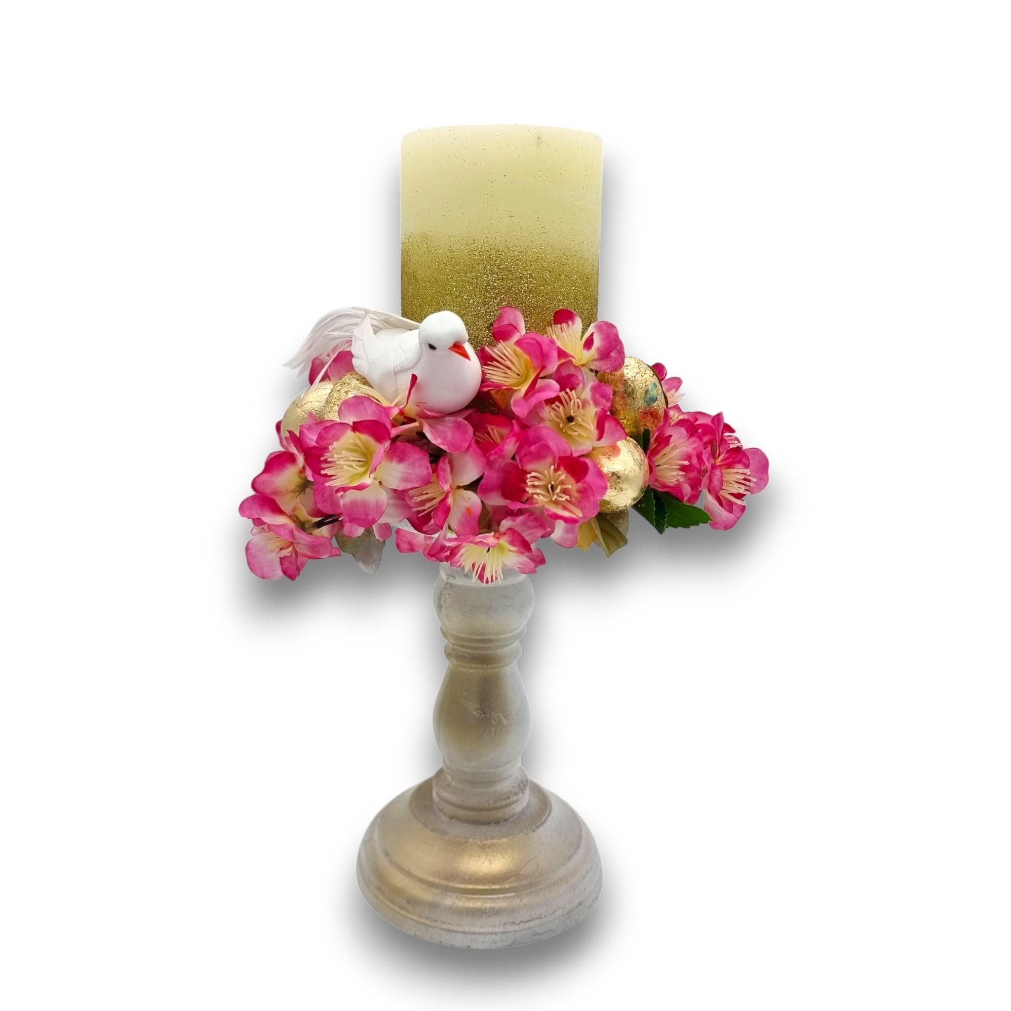 Aranjament de Paște cu Lumânare înaltă, 30 cm, Aurie – cu Flori de Cireș și Simboluri Pascale cm