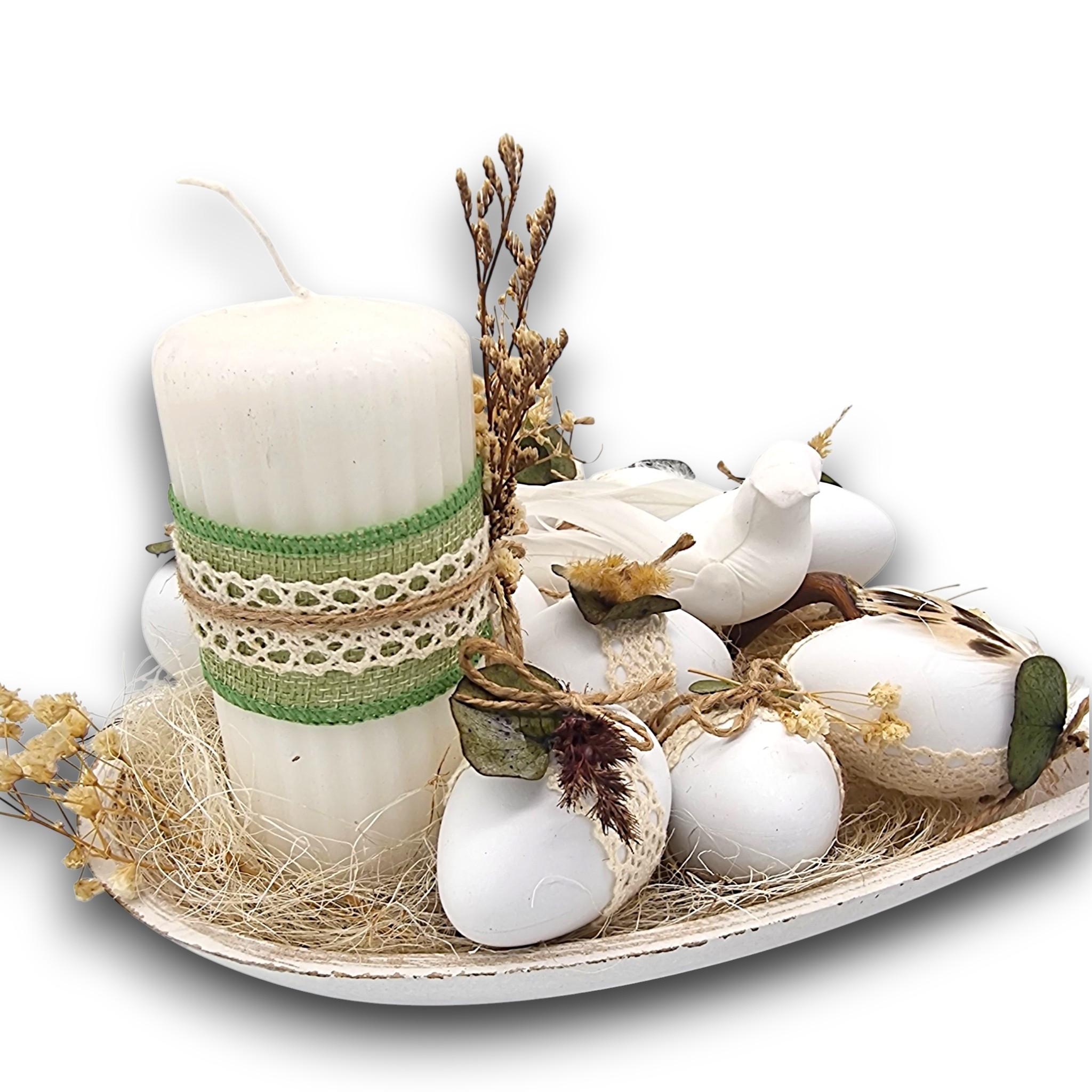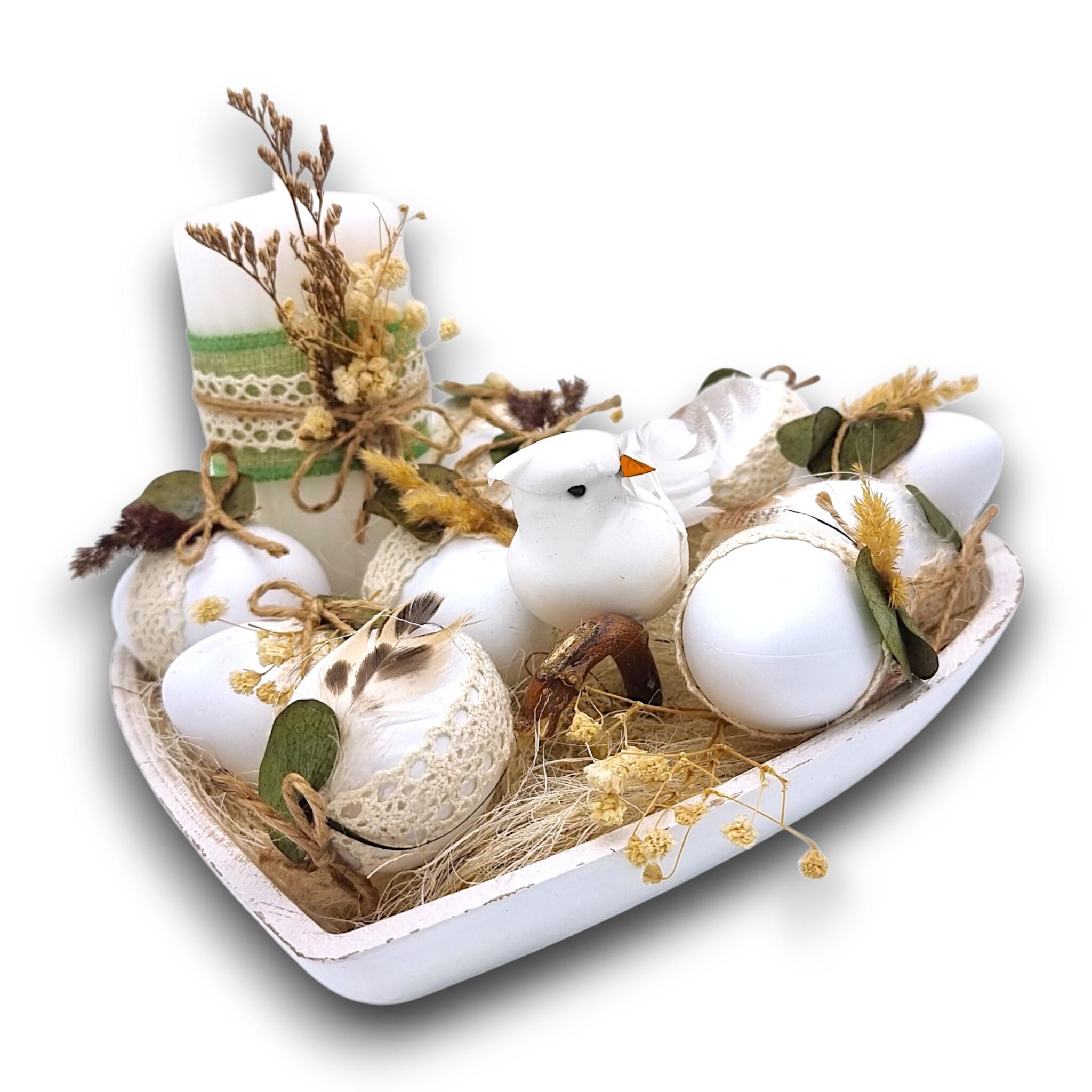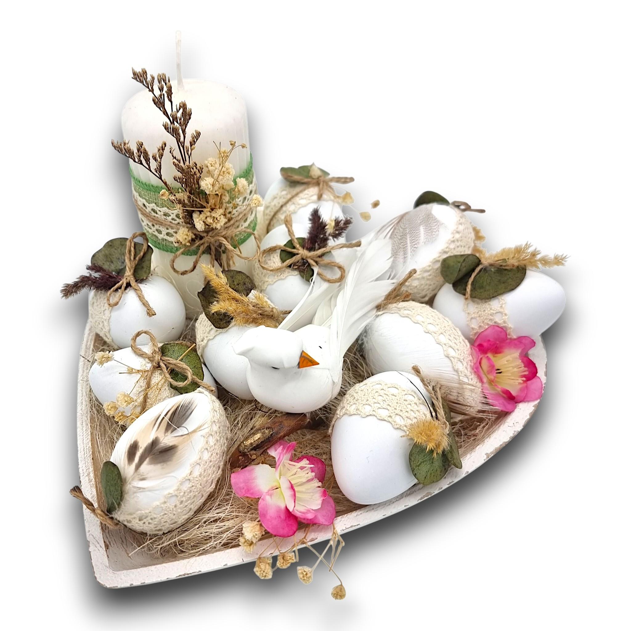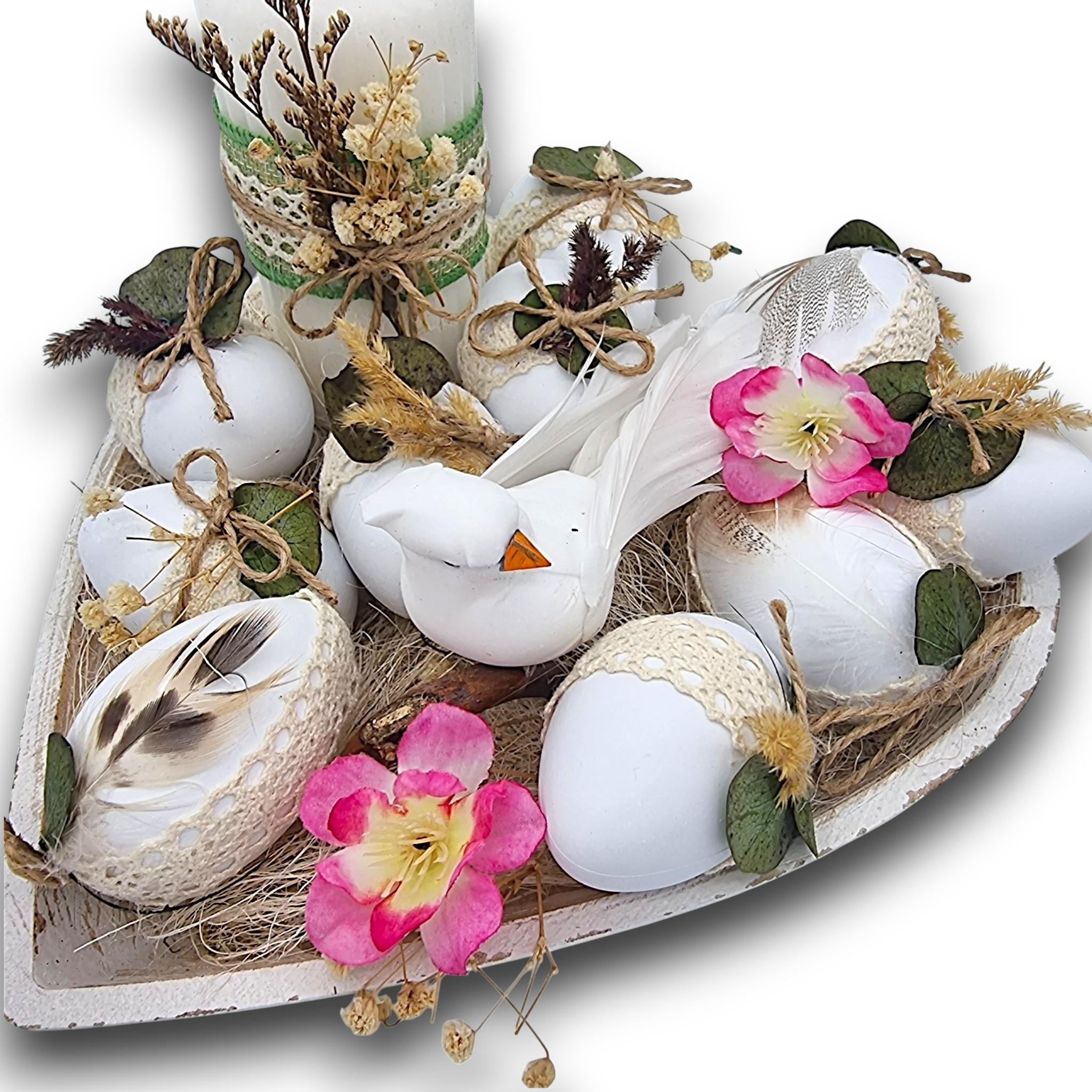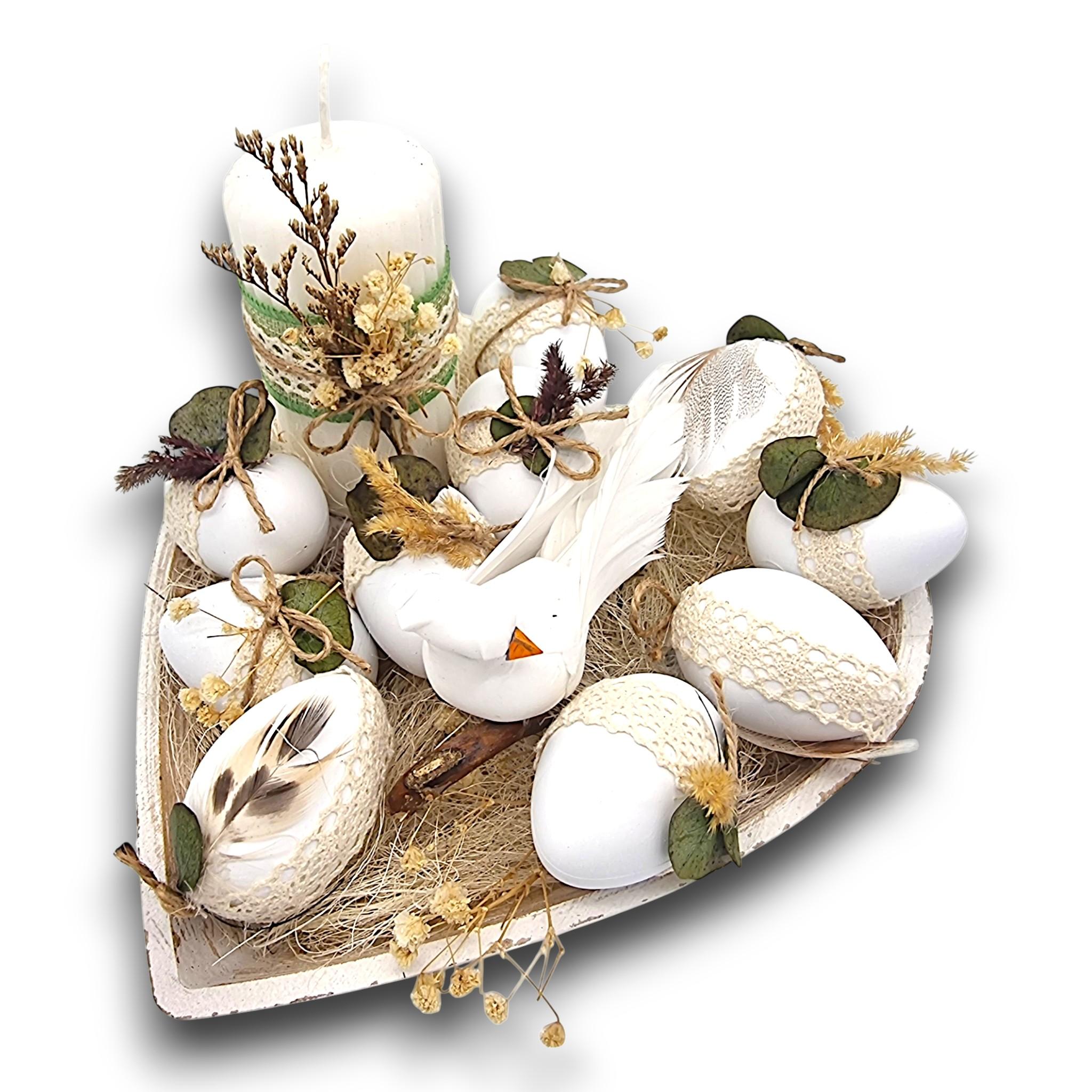 Aranjament Pascal 24 cm: Platou Inimă din Lemn Alb cu Ouă Boho și Lumânare