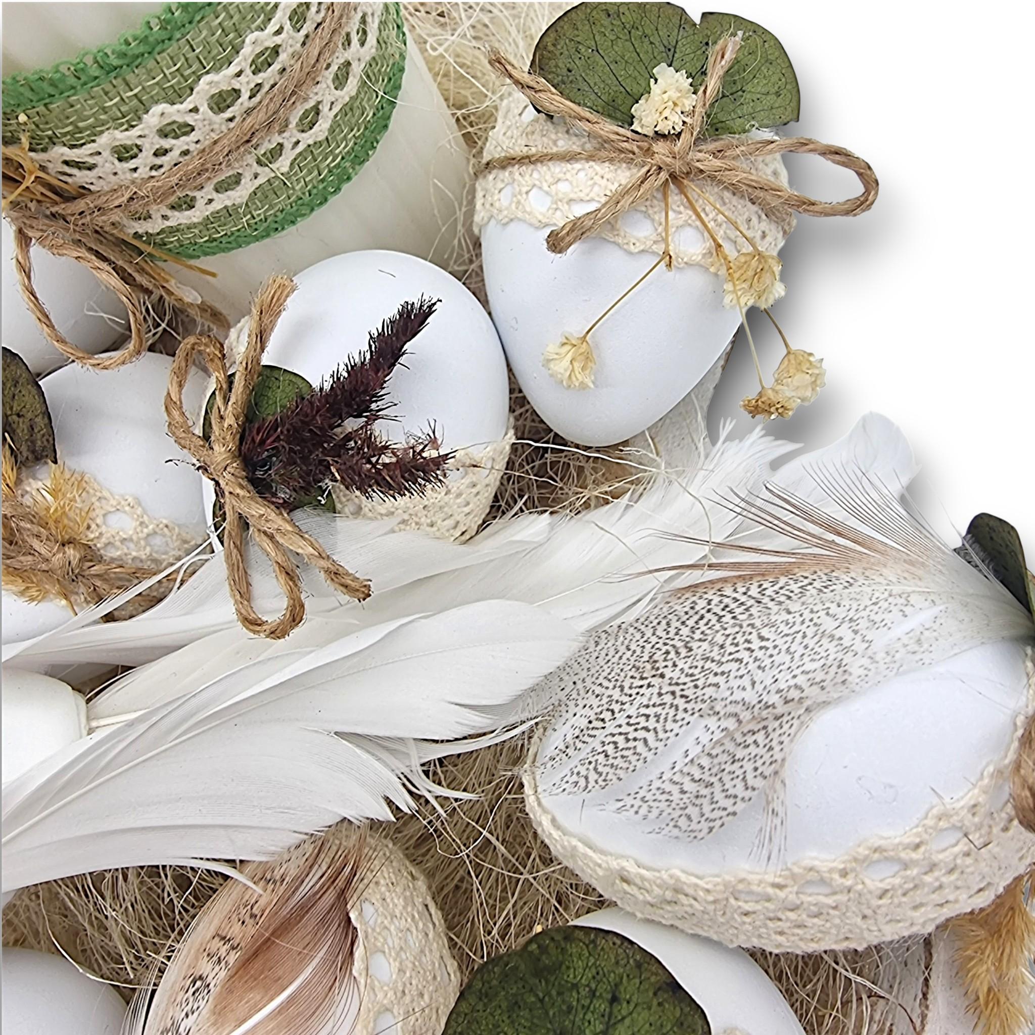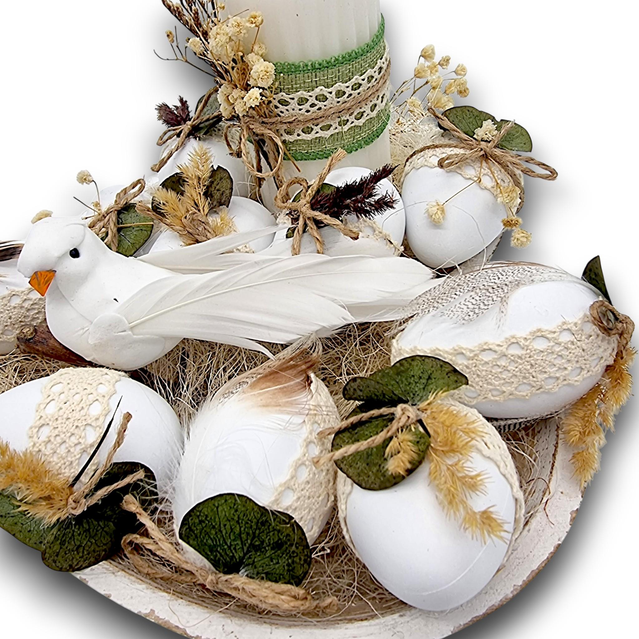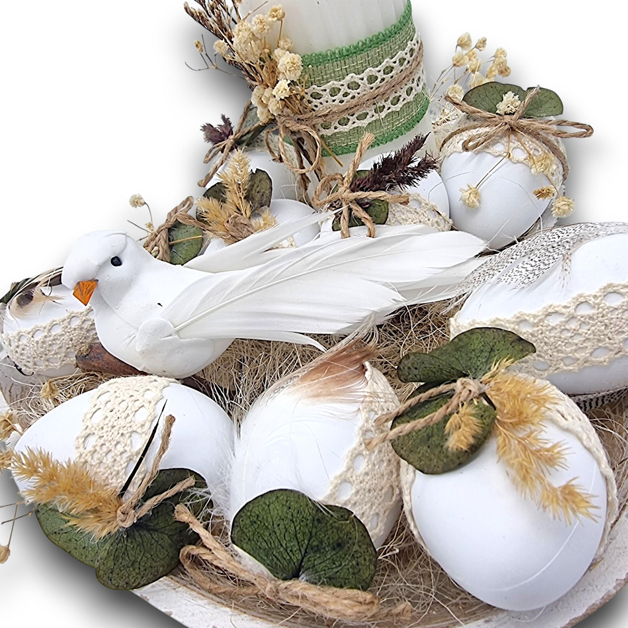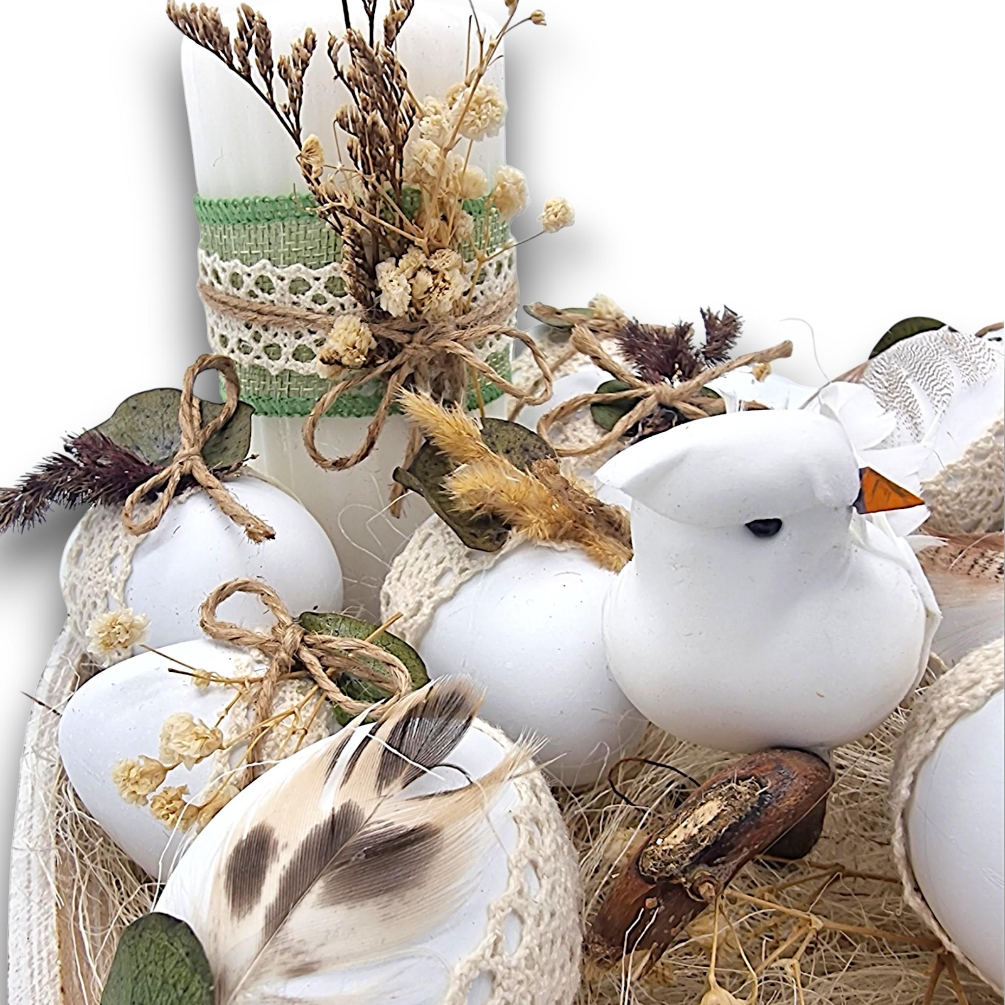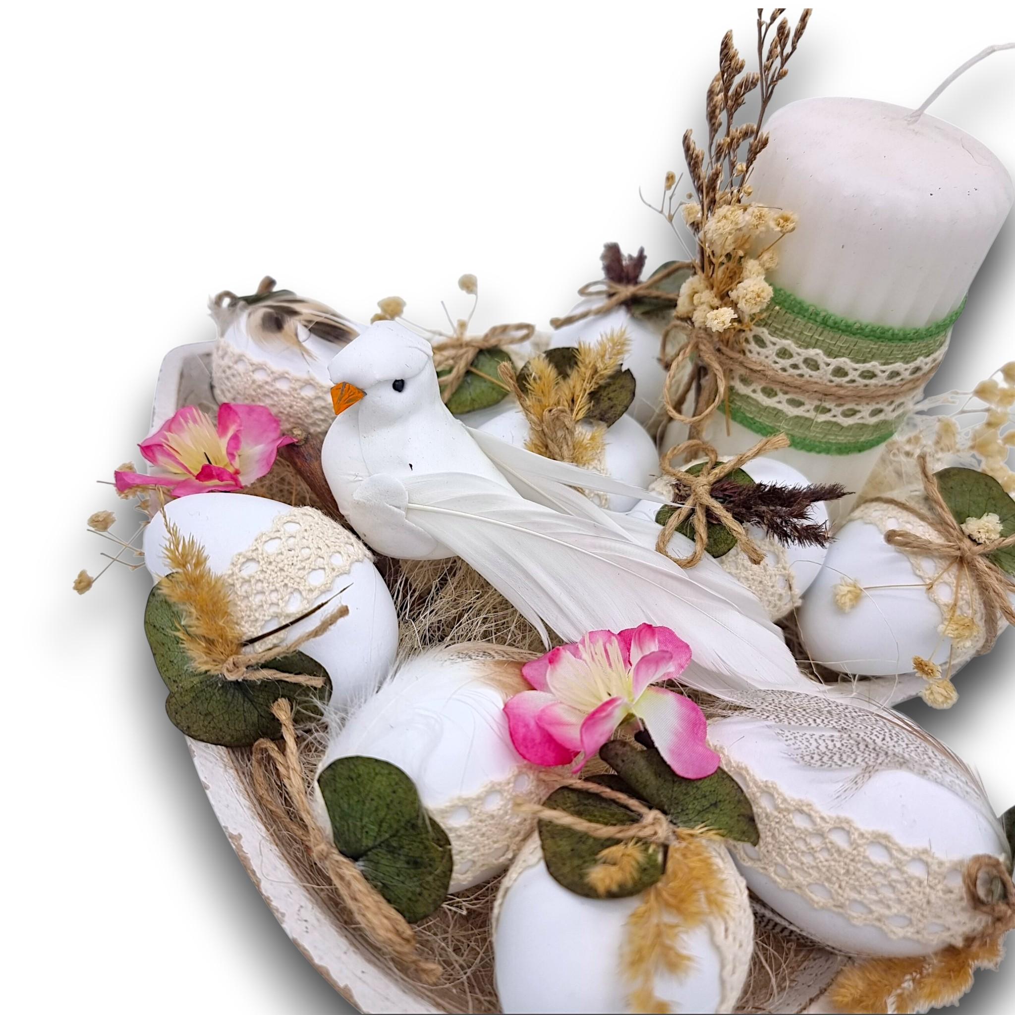 Pe un pat fin de iarbă de mare artificială albă se odihnesc ouă decorative mate, accesorizate manual cu o atenție meticuloasă la detalii. Fiecare ou poartă amprenta stilului rustic-elegant, fiind decorat cu dantelă fină din bumbac, sfoară naturală de iută, pene delicate și mici plante naturale uscate. Pentru un strop de culoare vibrantă și energie, designul este întregit de două flori de cireș roz. Întregul peisaj prinde viață datorită prezenței grațioase a unui porumbel alb decorativ, așezat pe o crenguță de lemn.