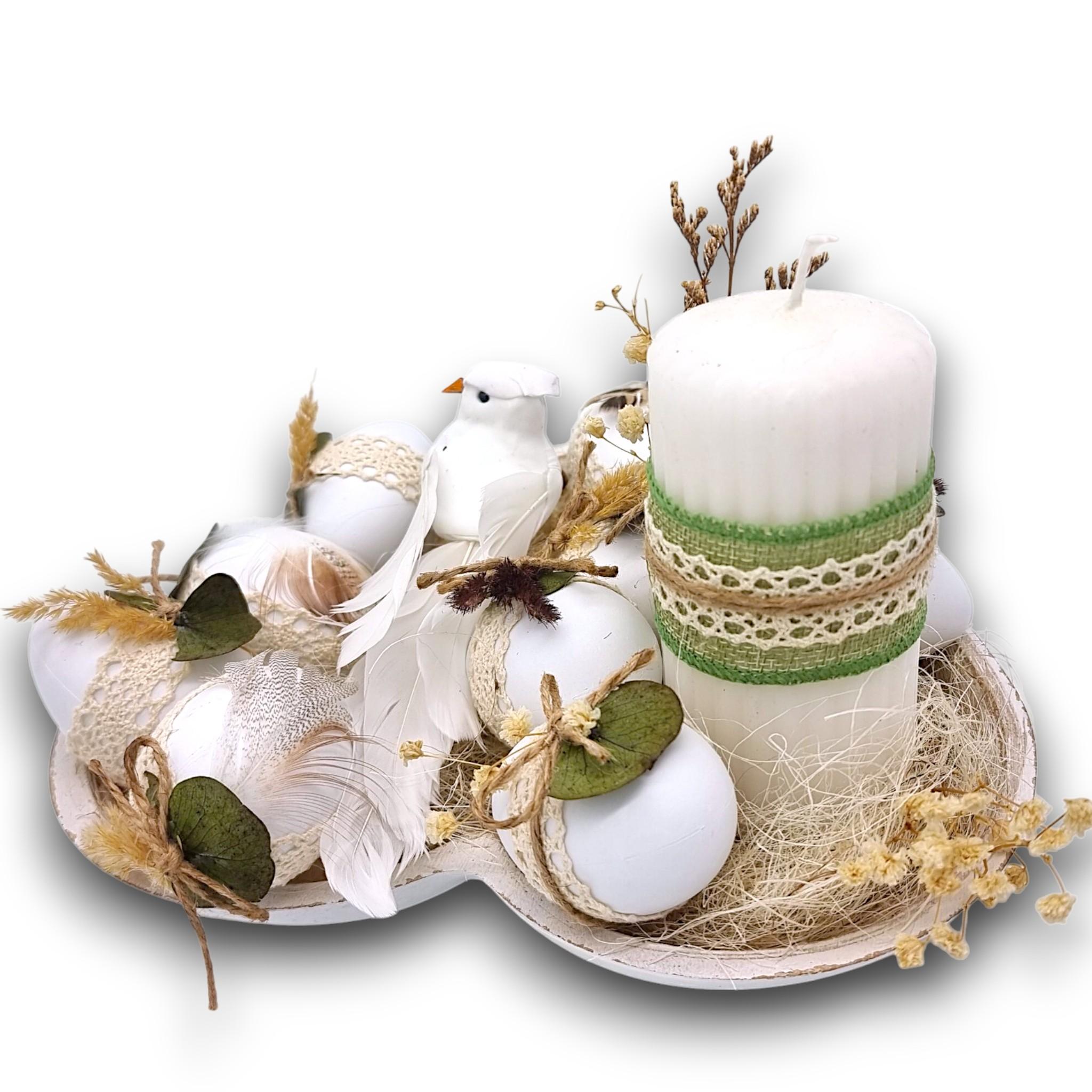 Elemente incluse: Platou lemn, lumânare albă (interschimbabilă), ouă decorate, porumbel alb, crenguță lemn, 2 flori de cireș roz, iarbă de mare artificială albă.