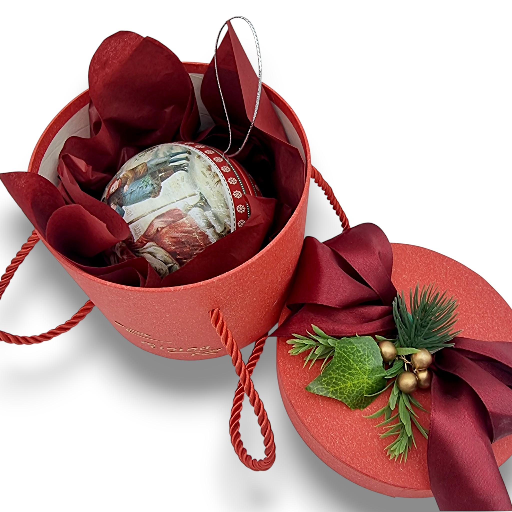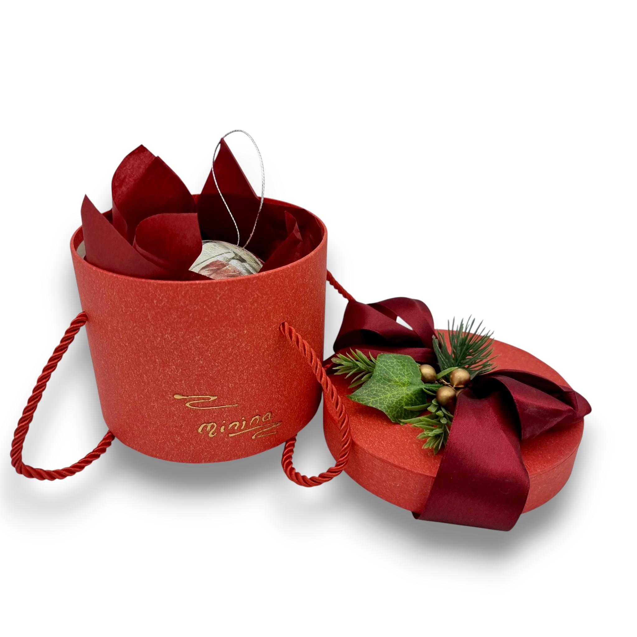 - In cutie eleganta, cilindrică, din carton rigid, prevăzută cu mânere din șnur mătăsos. Capacul este decorat de sezon, cu frunze artificiale si mici elemente specifice Craciunului.