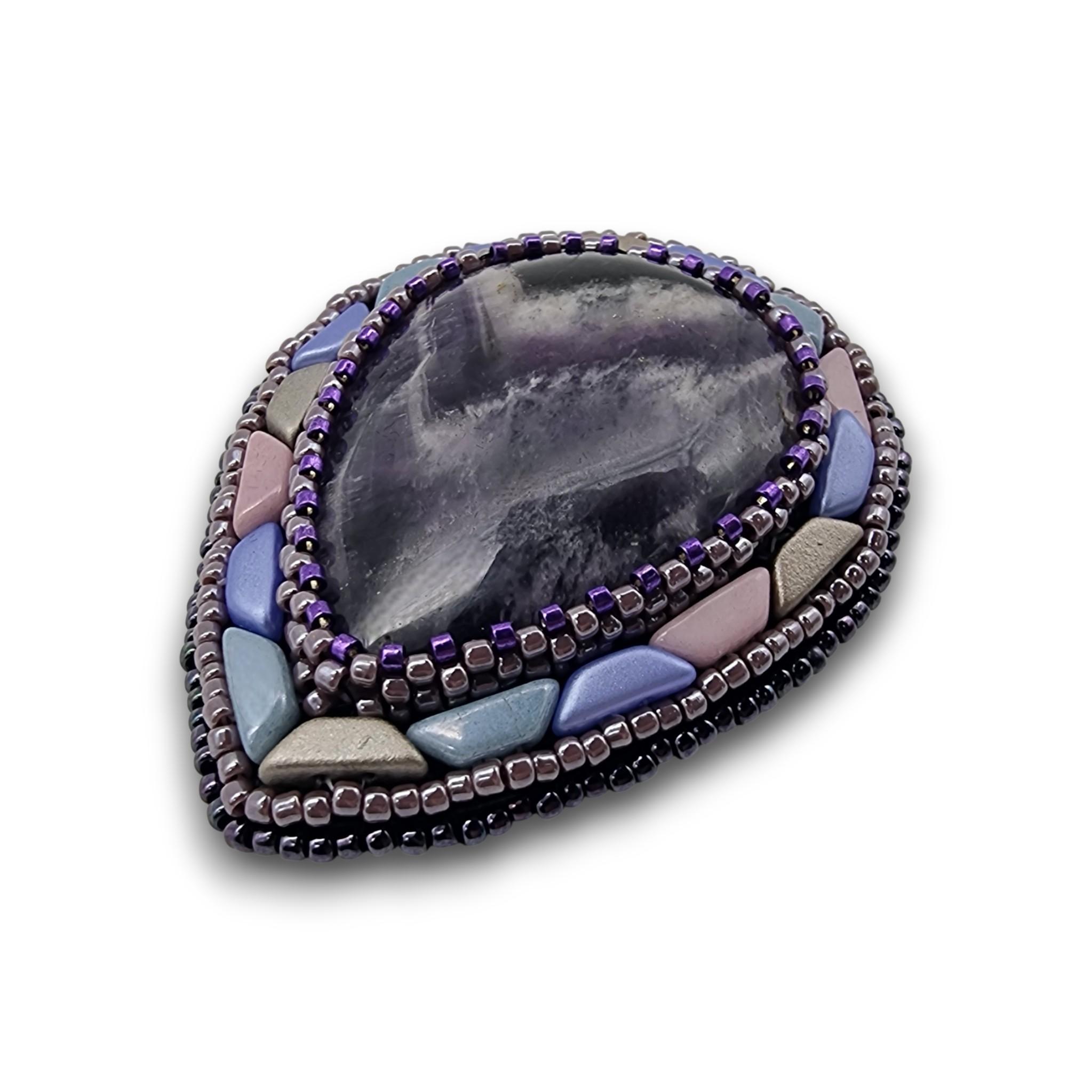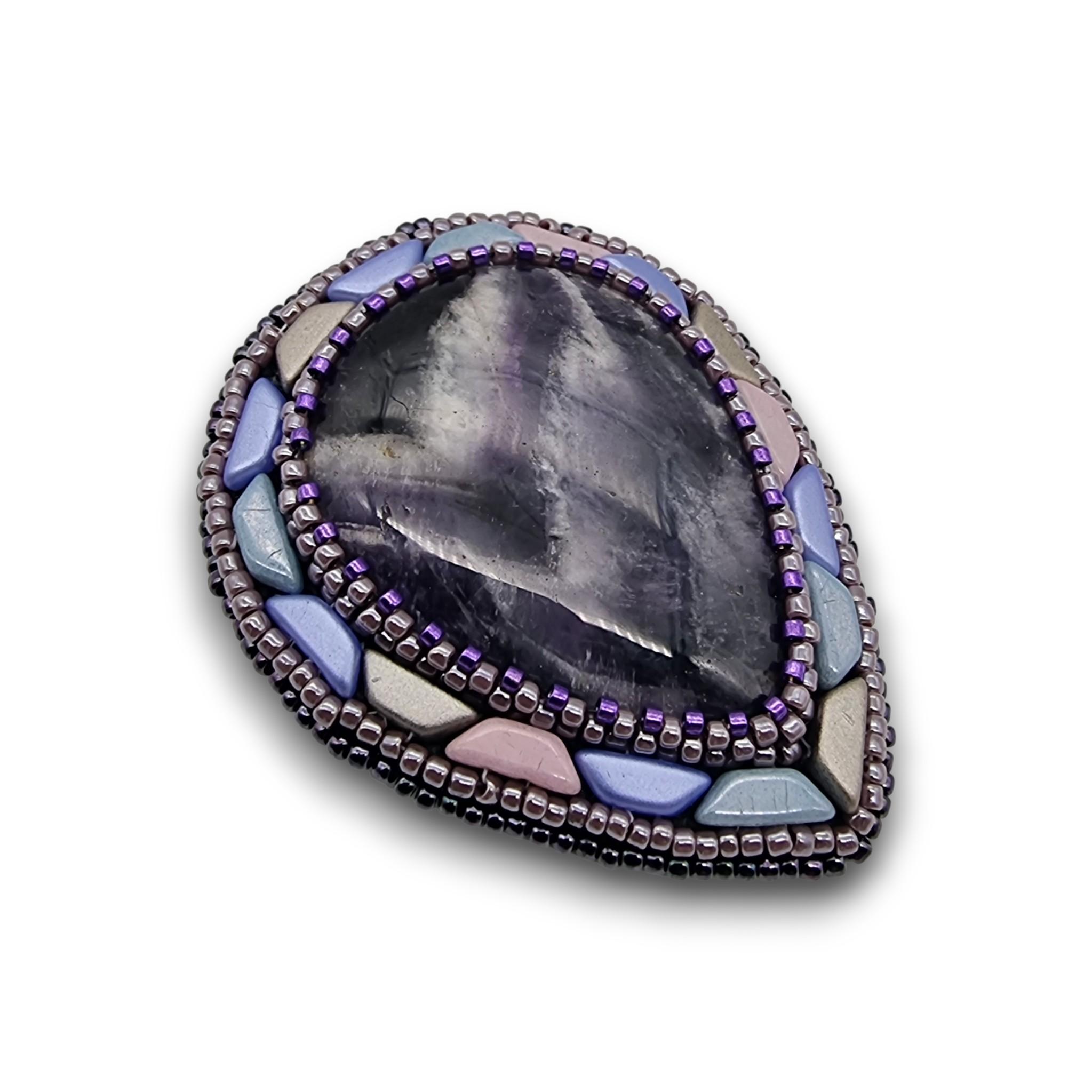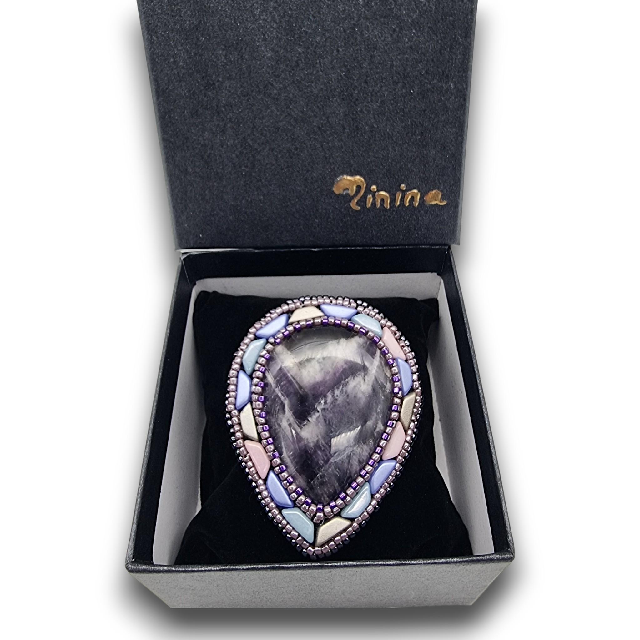 Această broșă este realizată manual, având ca punct central un ametist în nuanțe naturale de violet și gri. Piatra este încadrată de o ramă delicată, lucrată prin tehnica peyote, care îi subliniază forma și textura.