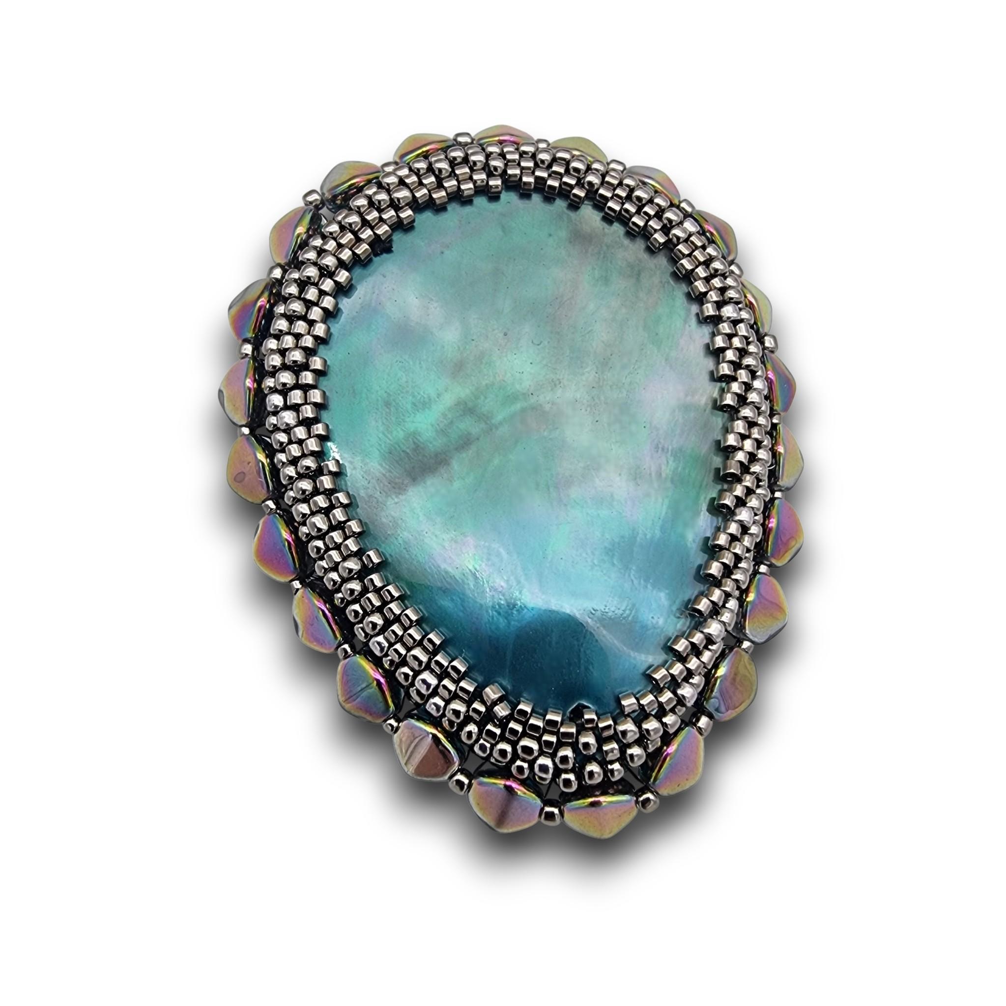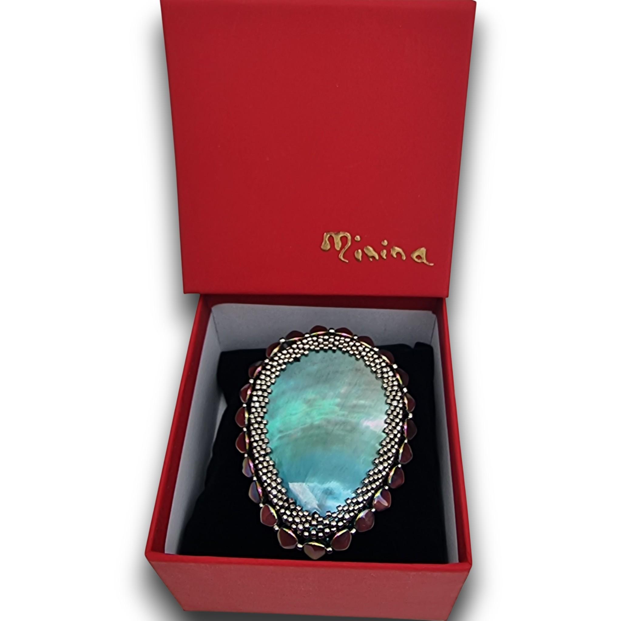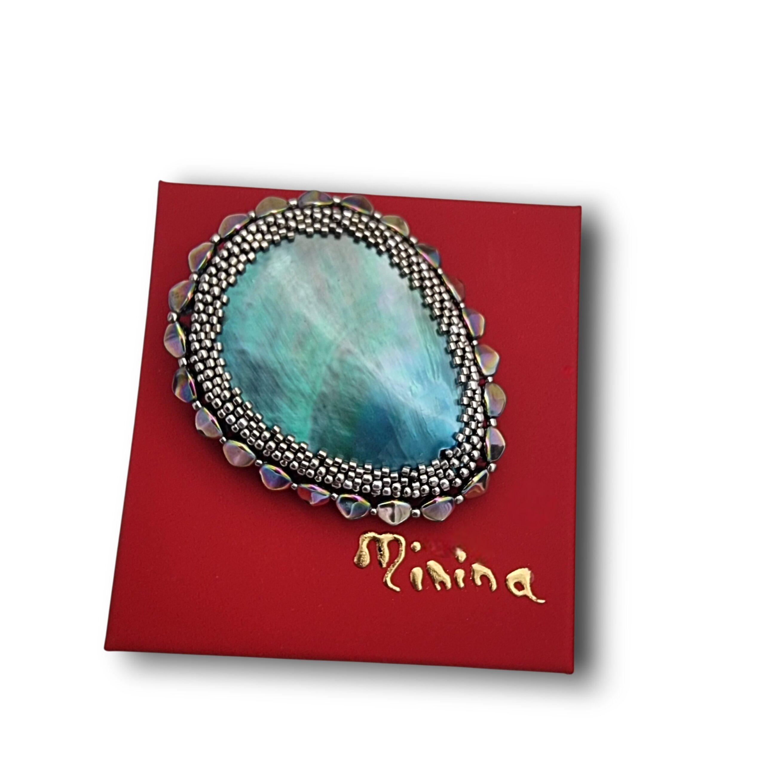 Descoperă o bijuterie de o versatilitate remarcabilă, care îmbină strălucirea naturală a mării cu precizia artizanatului japonez. Piesa centrală este un cabochon generos de sidef, cu reflexii fascinante de verde și albastru, pus în valoare de o tehnică de broderie manuală minuțioasă.