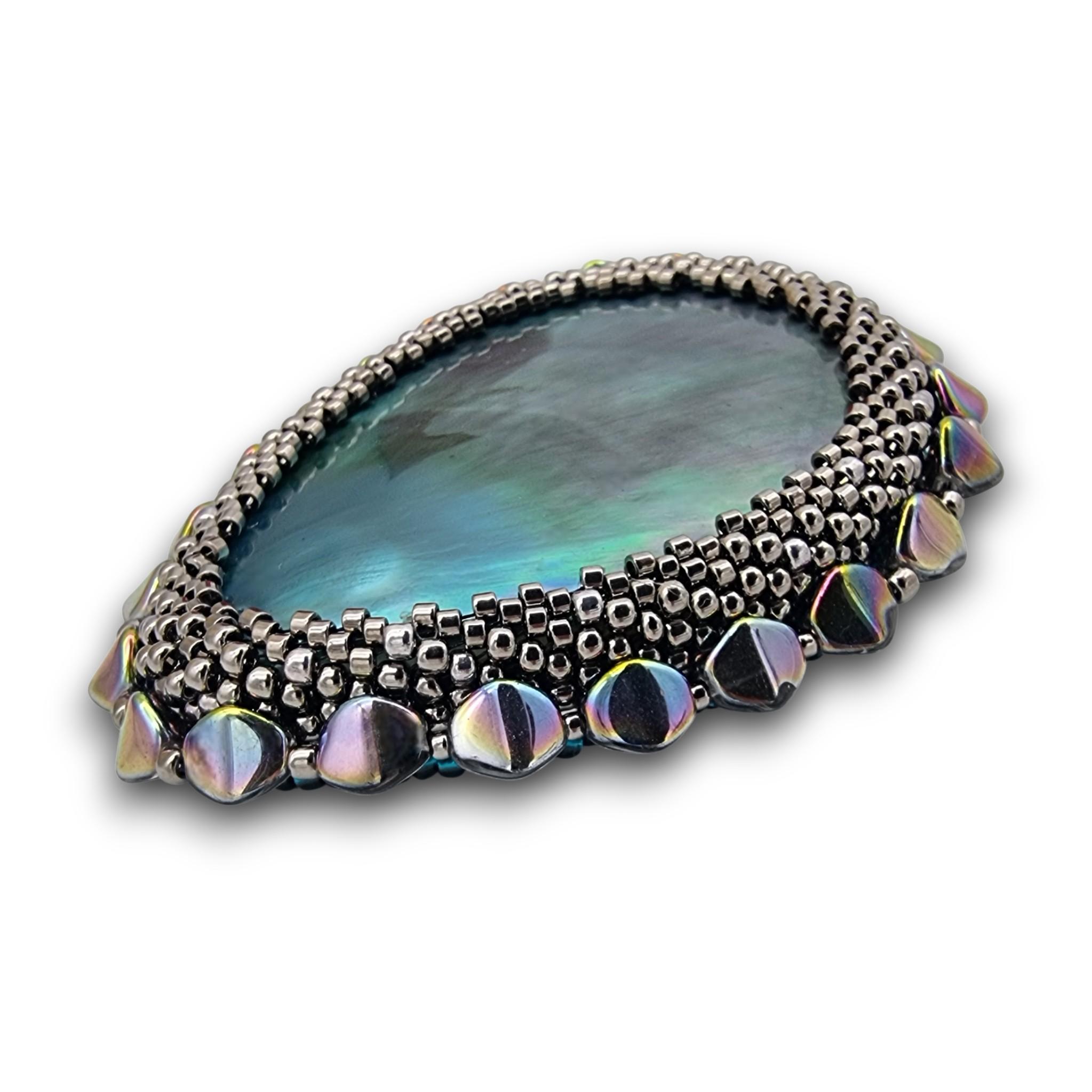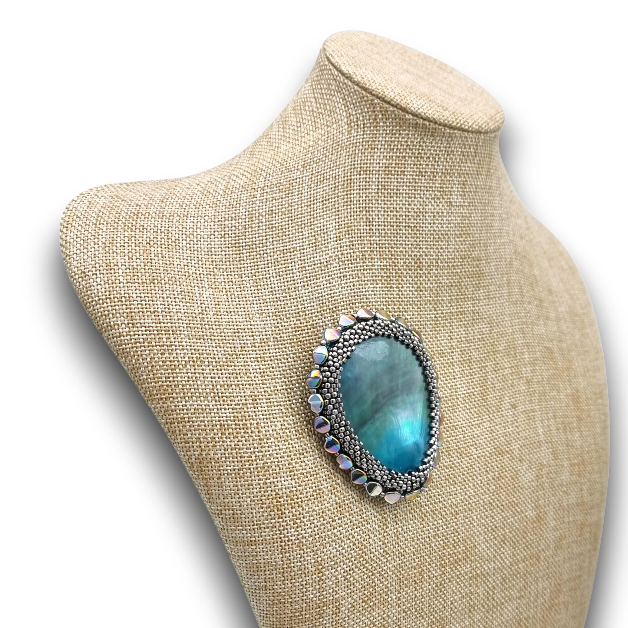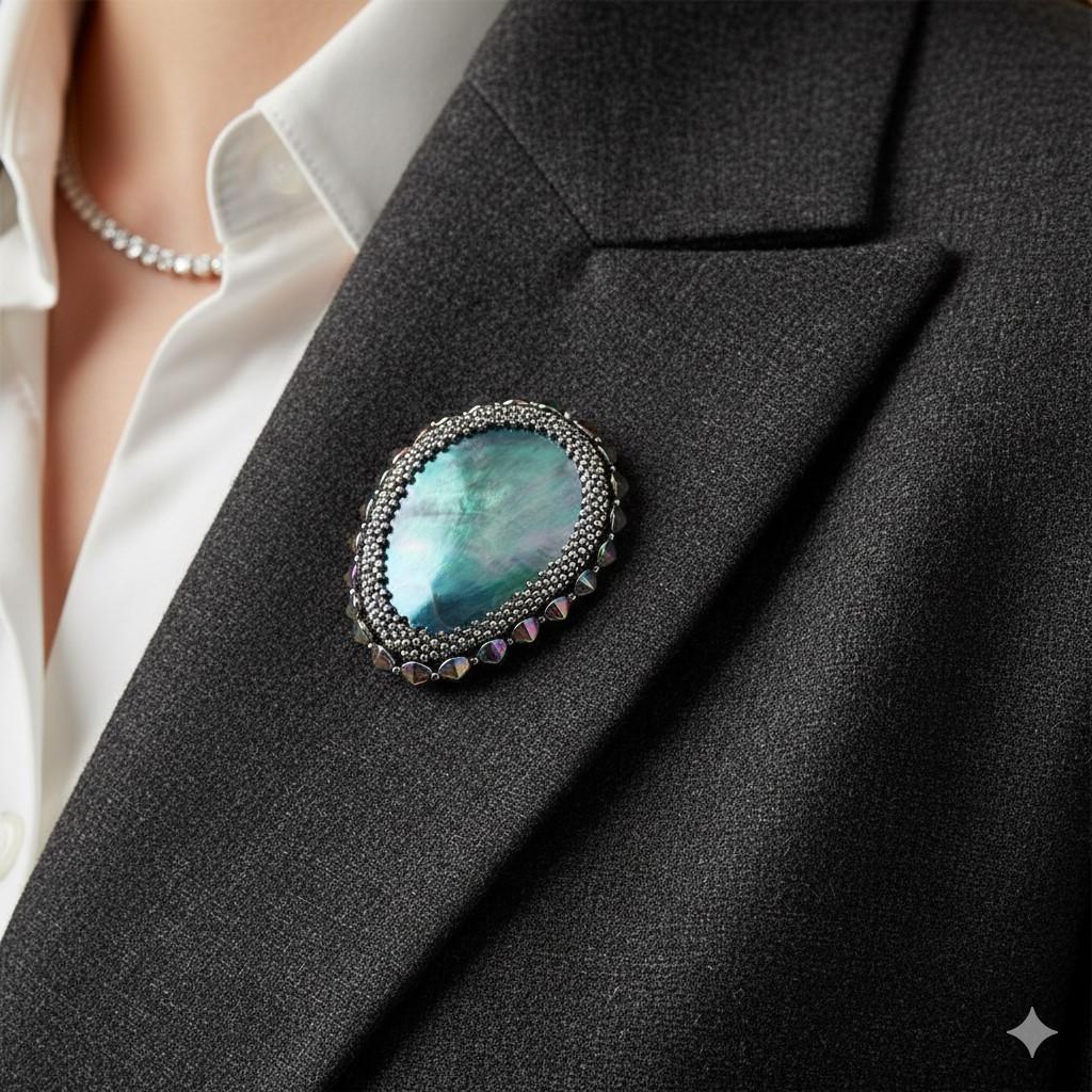 Descoperă o bijuterie de o versatilitate remarcabilă, care îmbină strălucirea naturală a mării cu precizia artizanatului japonez. Piesa centrală este un cabochon generos de sidef, cu reflexii fascinante de verde și albastru, pus în valoare de o tehnică de broderie manuală minuțioasă.