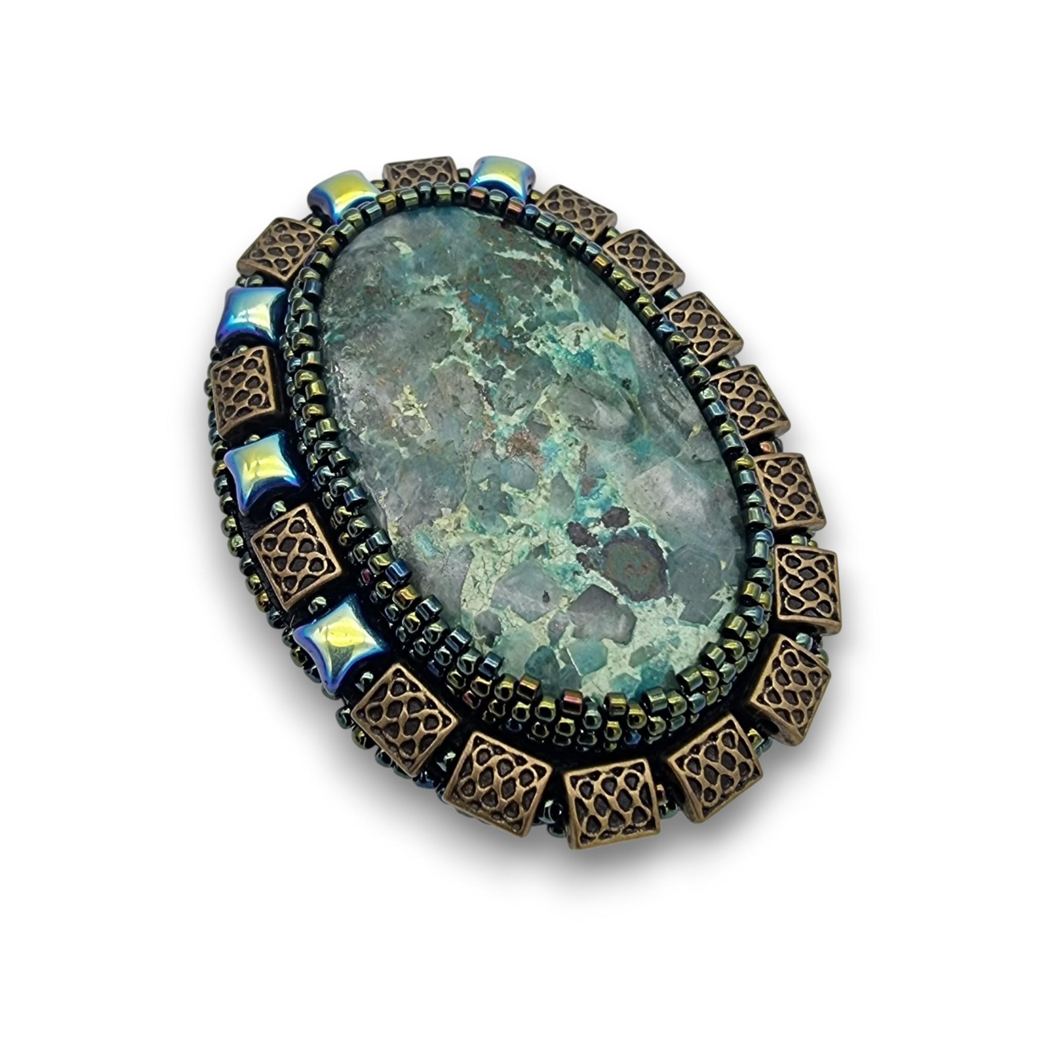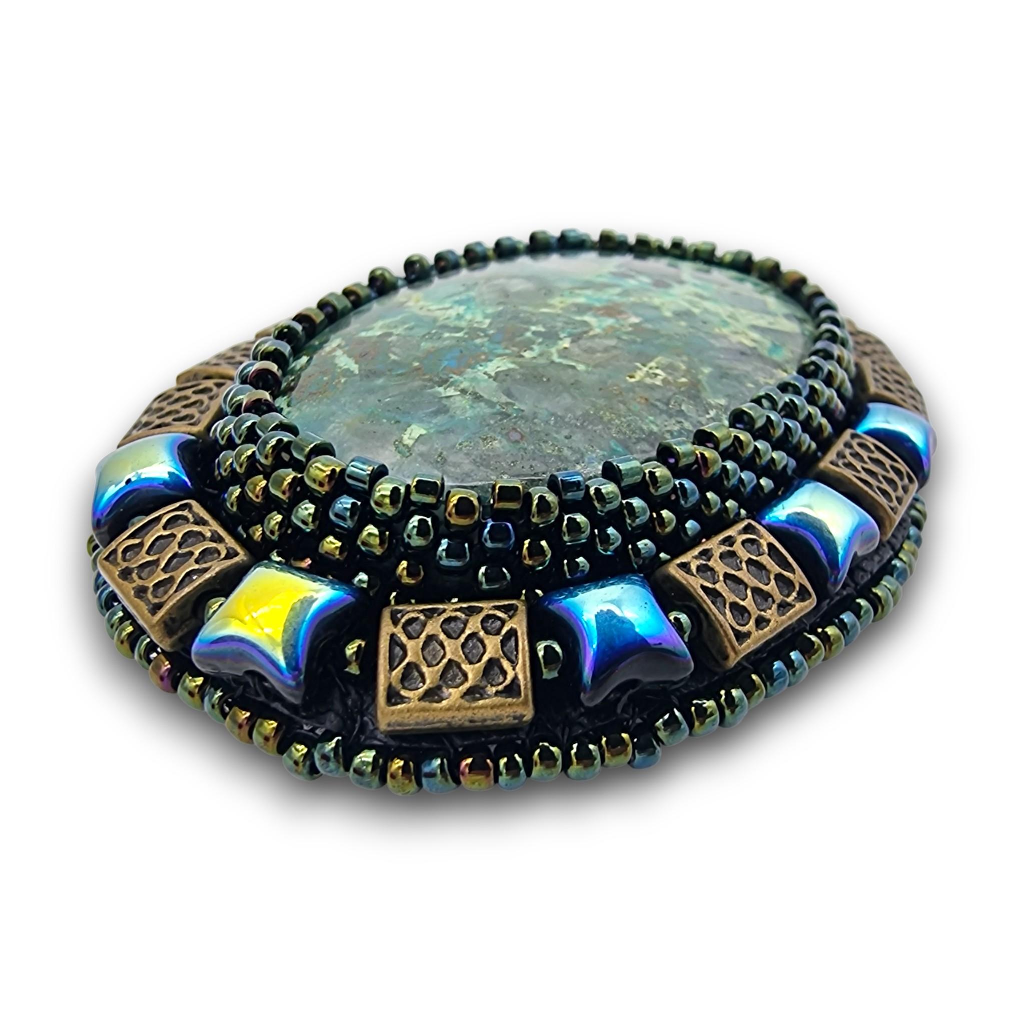 Piatra este înconjurata de o țesătura Peyote lucrată manual, din mărgele de sticlă japoneze Toho 0,8-1,2 mm culoare Irish Green-Brown. Pe margine avem o broderie de mărgele sticlă Cehia, in combinatie cu margele dreptunghiulare metalice