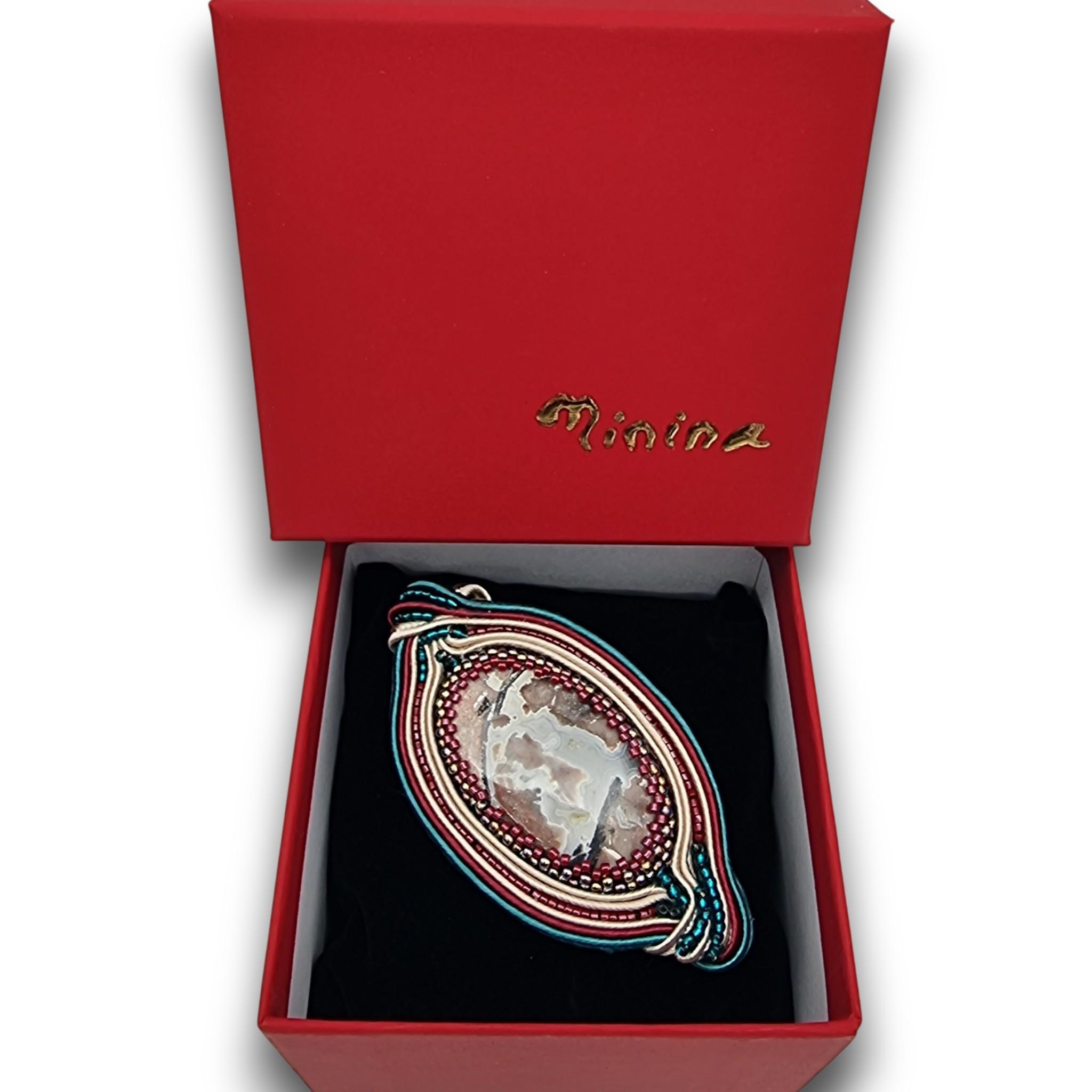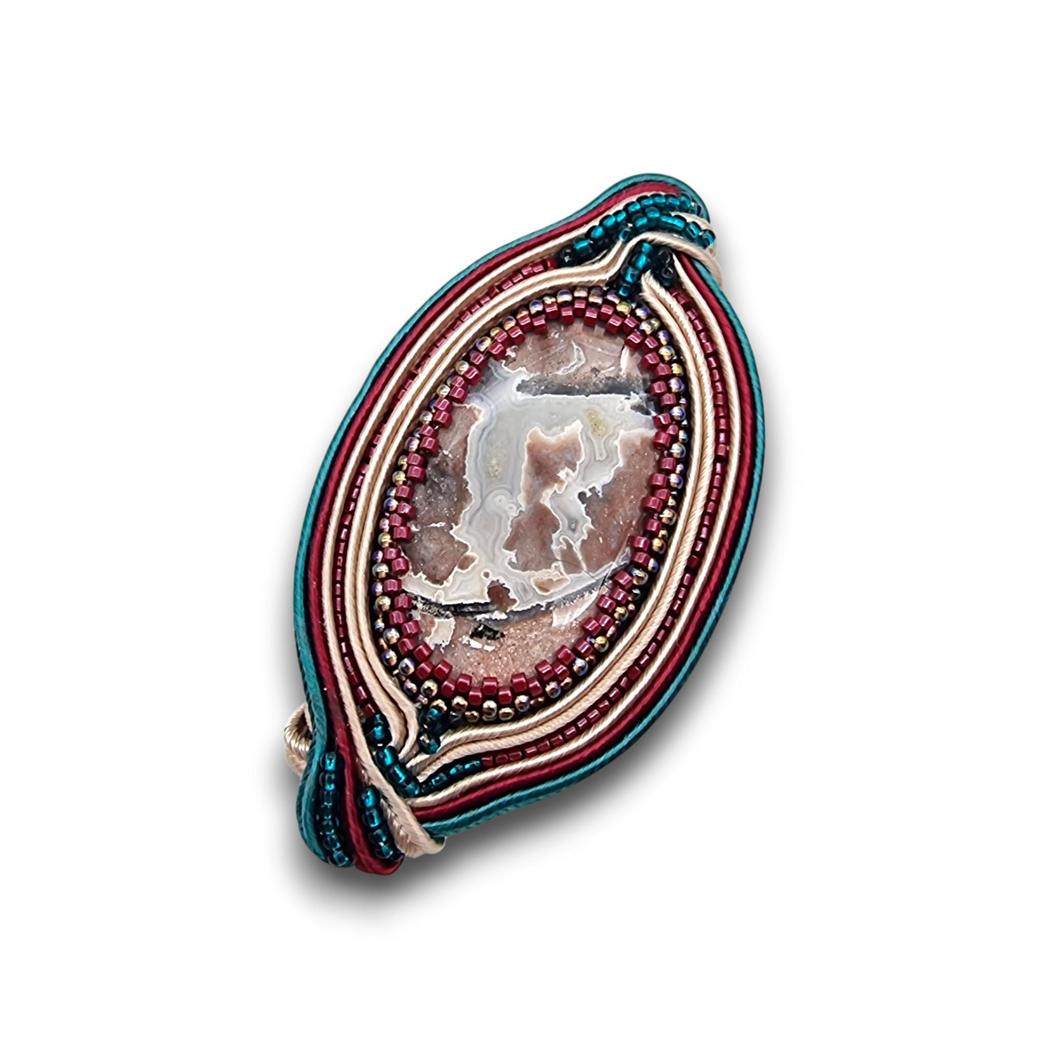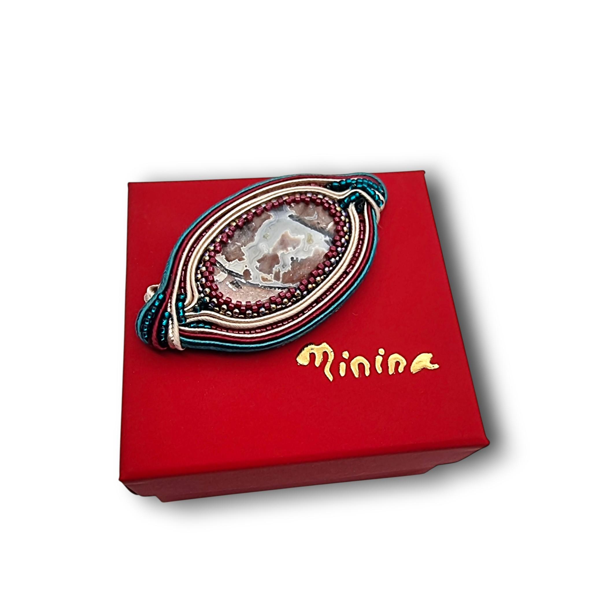 Materiale: Agat natural, șnur soutache premium, accesorii bronz, ac inox, piele.