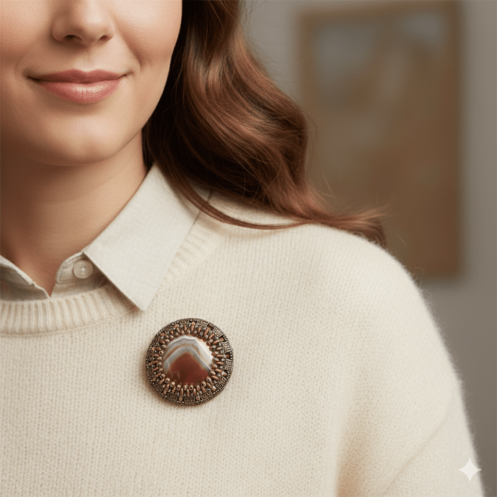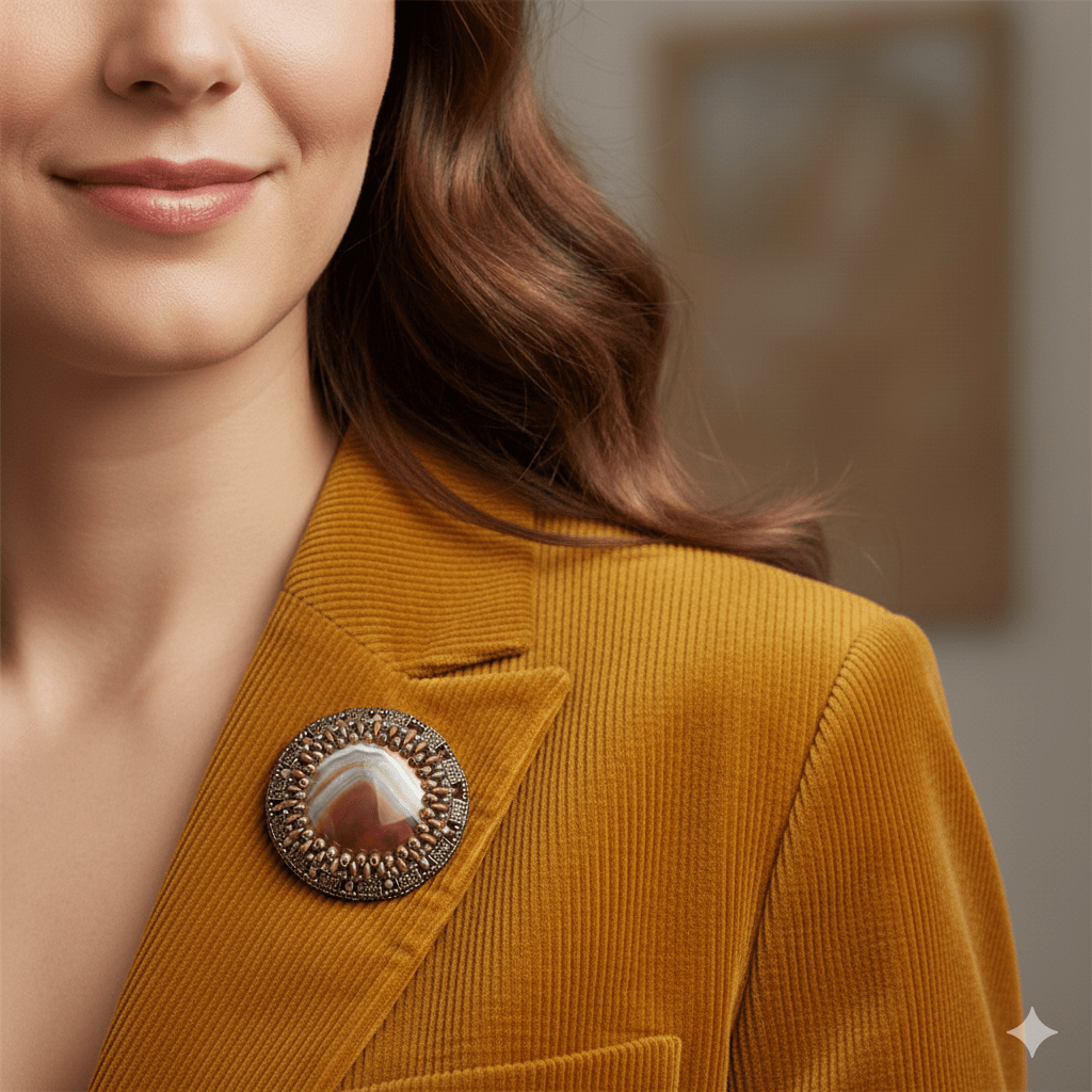- Accent de eșarfă: Folosiți o broșă pentru a fixa o eșarfă pe loc. Acest lucru nu numai că adaugă un element decorativ, dar servește și unui scop practic, menținând eșarfa ordonată.