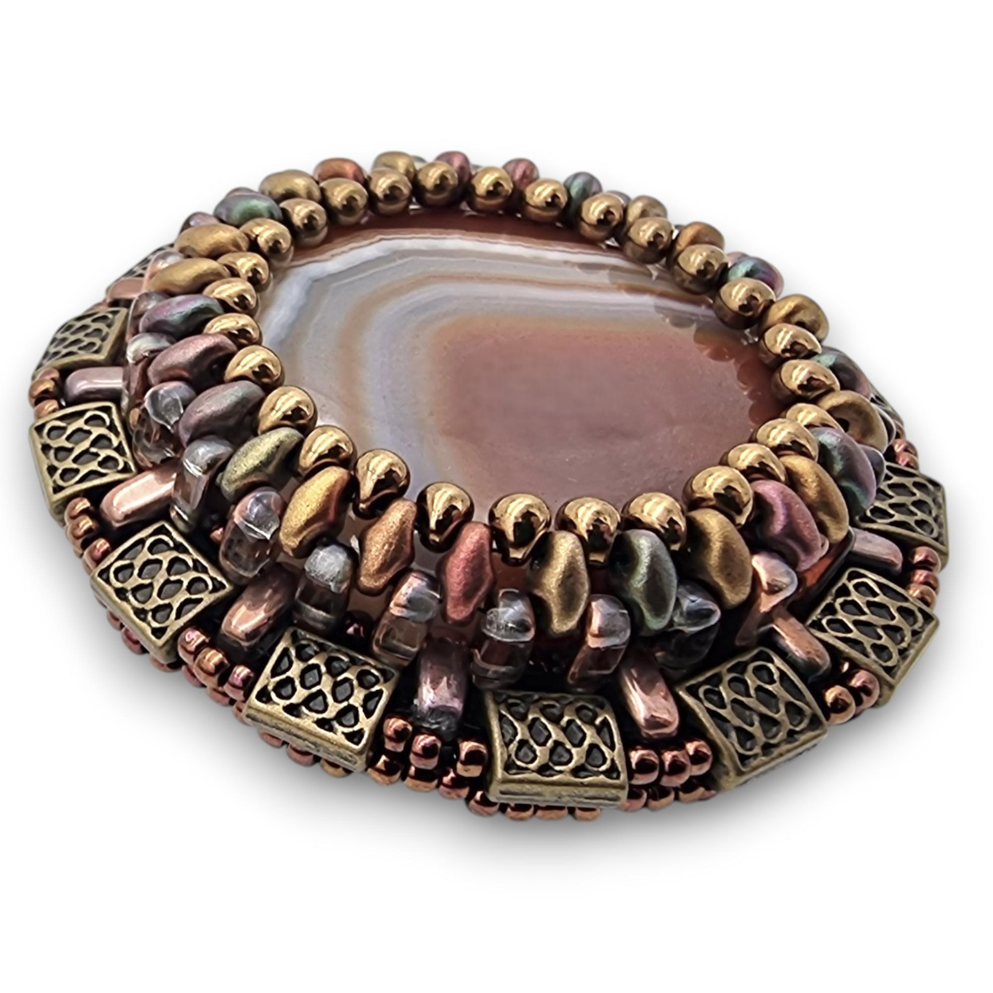 Agatul este înconjurat de o țesătura lucrată manual din diverse tipuri de mărgele de sticlă japoneze, în nuanțe de auriu antic, bronz vitrail. In jurul ei avem o broderie de margele sticla japoneze lungi si margele dreptunghiulare meatlice bronz