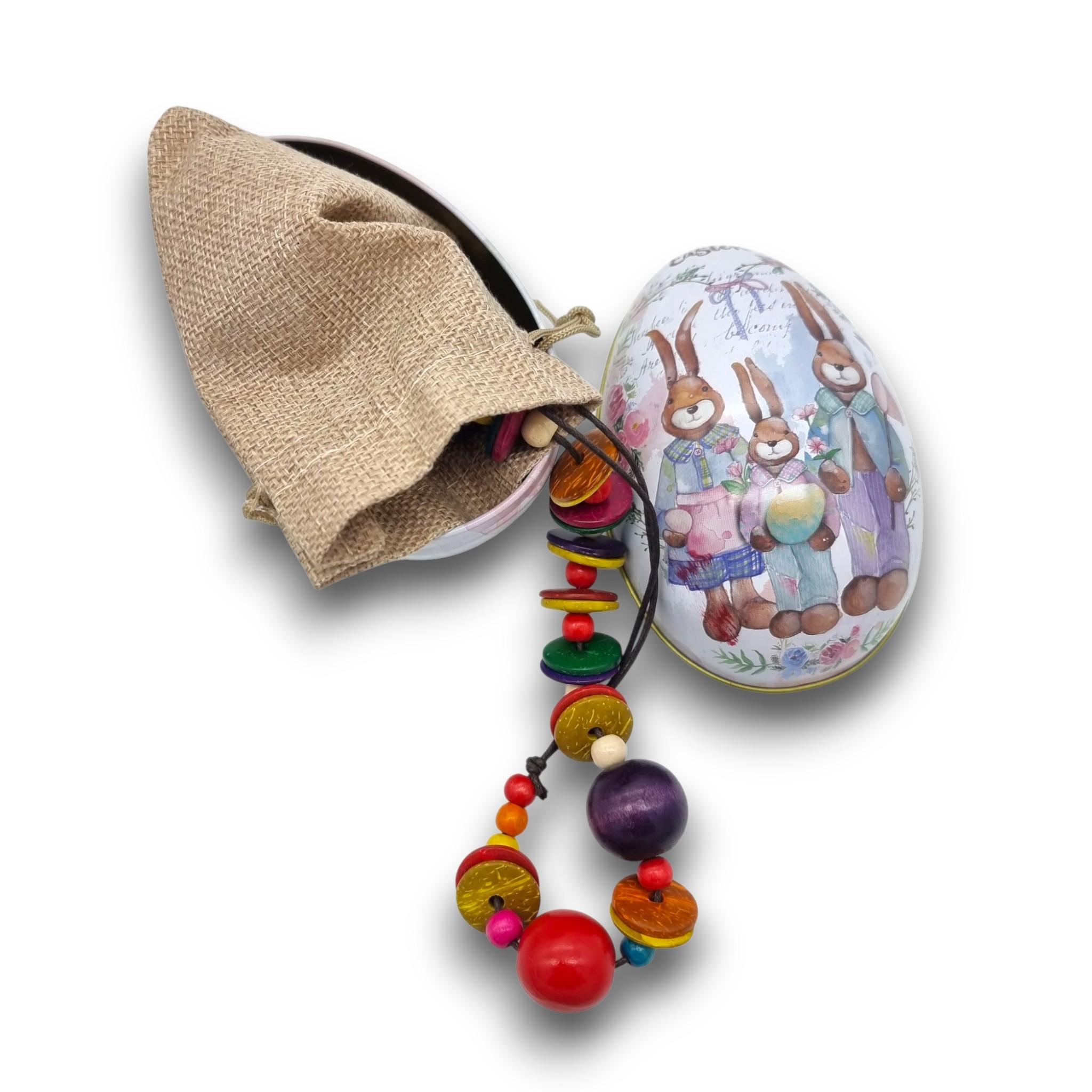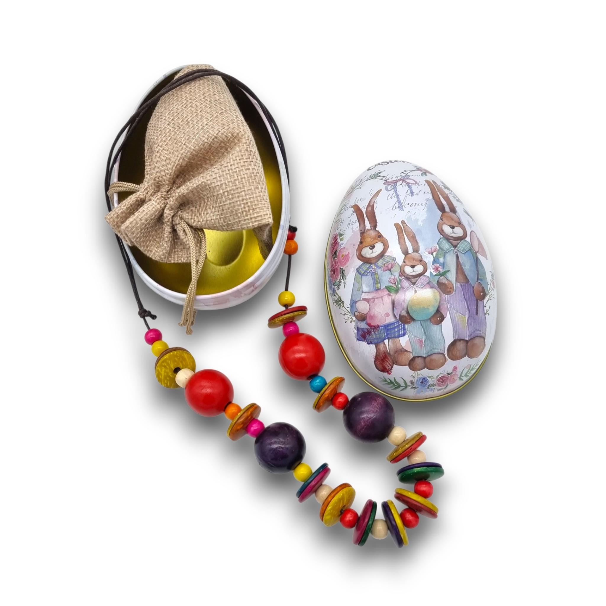 Acest set este interpretarea perfectă a cadoului de Paște modern: exteriorul clasic și jucăuș ascunde un interior natural și sustenabil. Oul metalic, decorat cu ilustrații vintage cu iepurași, devine ulterior o cutie de amintiri sau un element decorativ deosebit. Colierul din lemn reprezintă conexiunea cu pământul și energia solară a culorilor, fiind un simbol al optimismului.