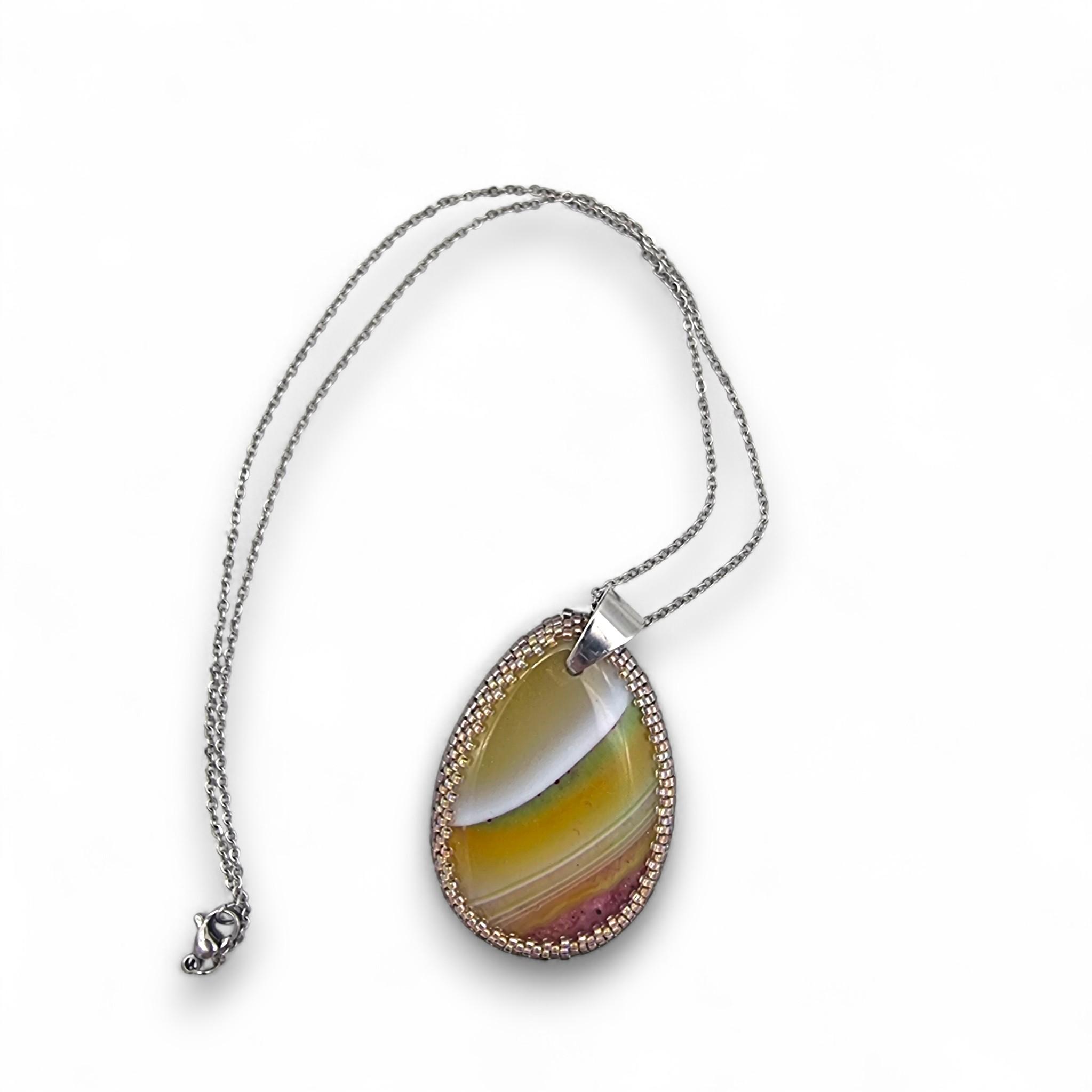 Colier cu pandantiv agată dungată, inconjurată cu ţesătură lucrată manual (peyote)