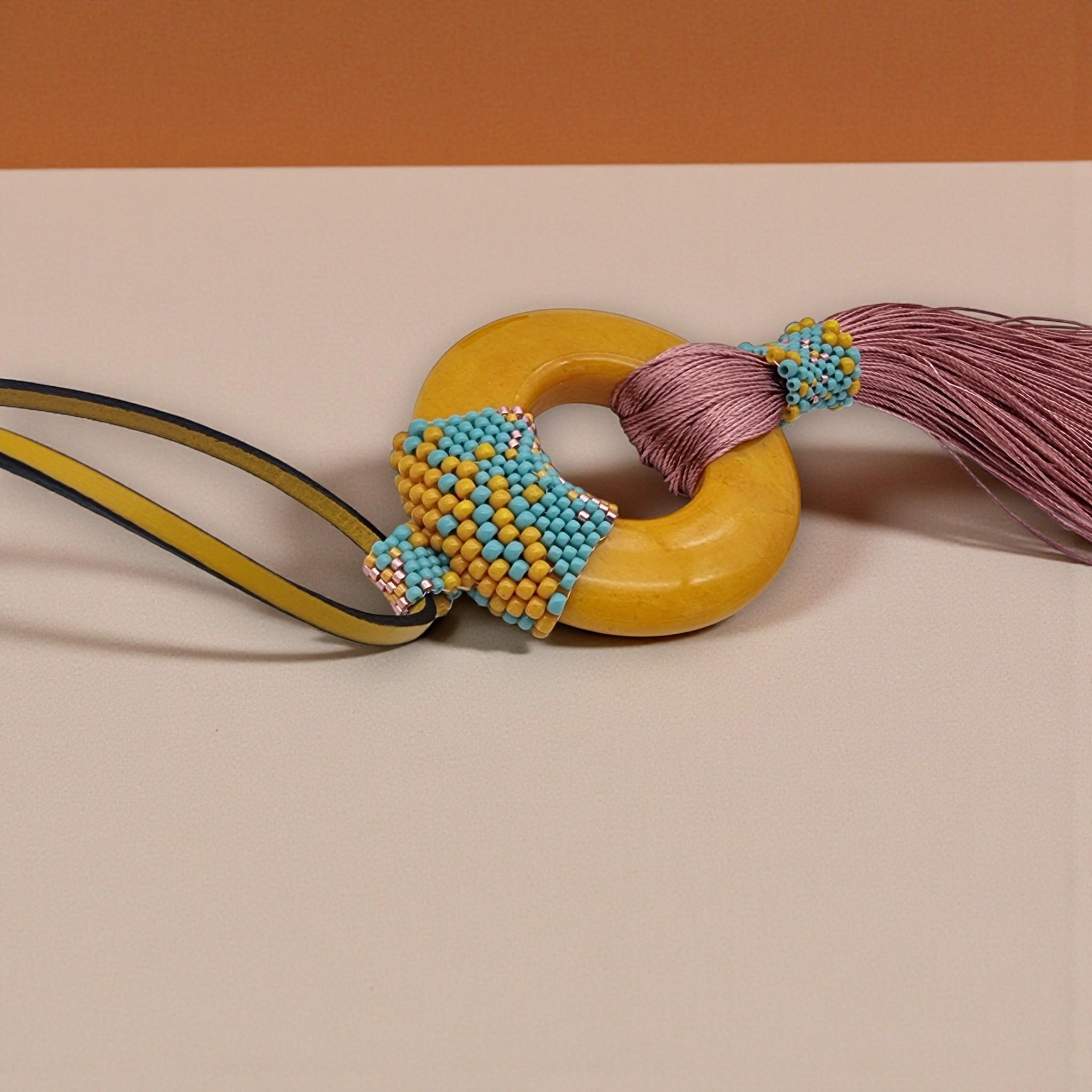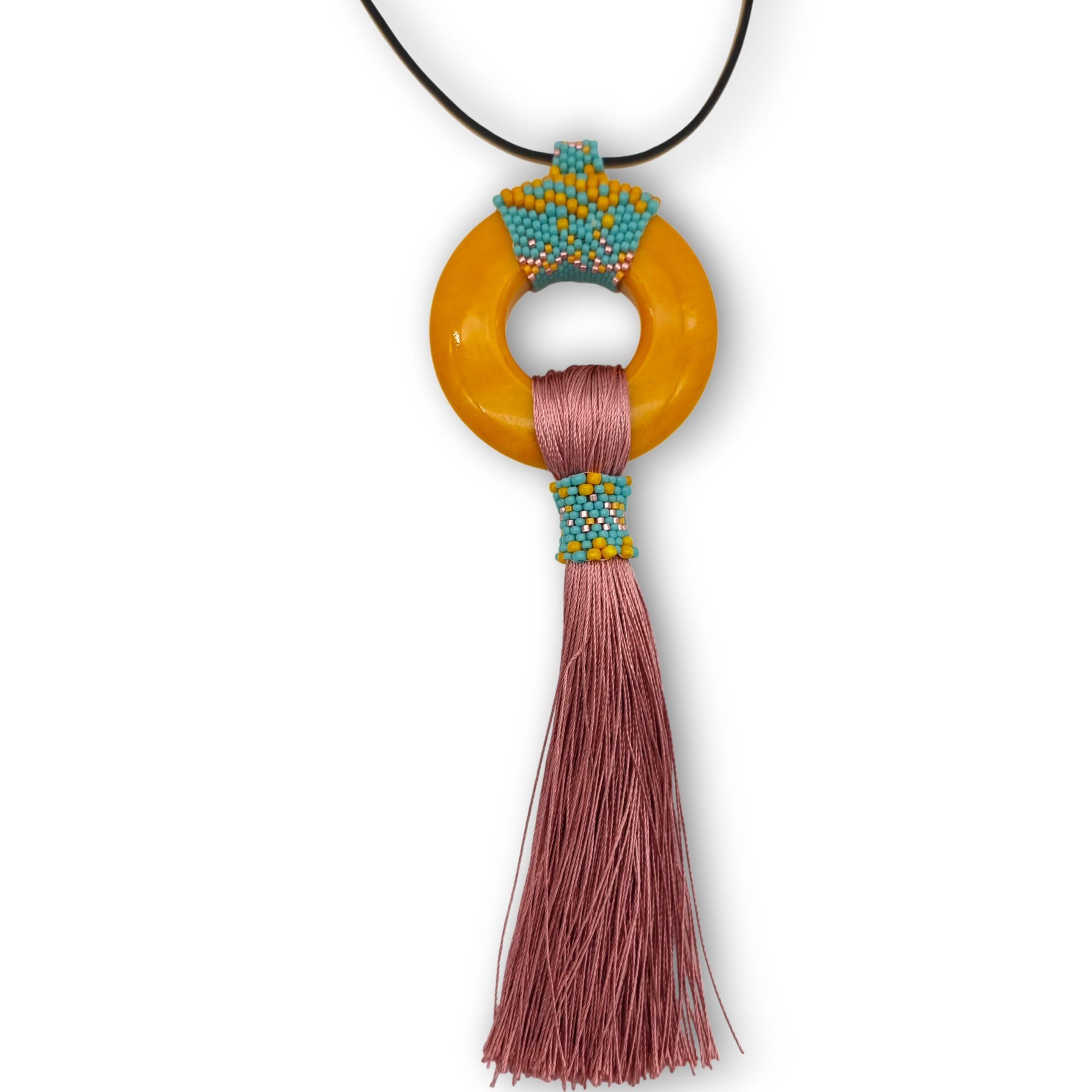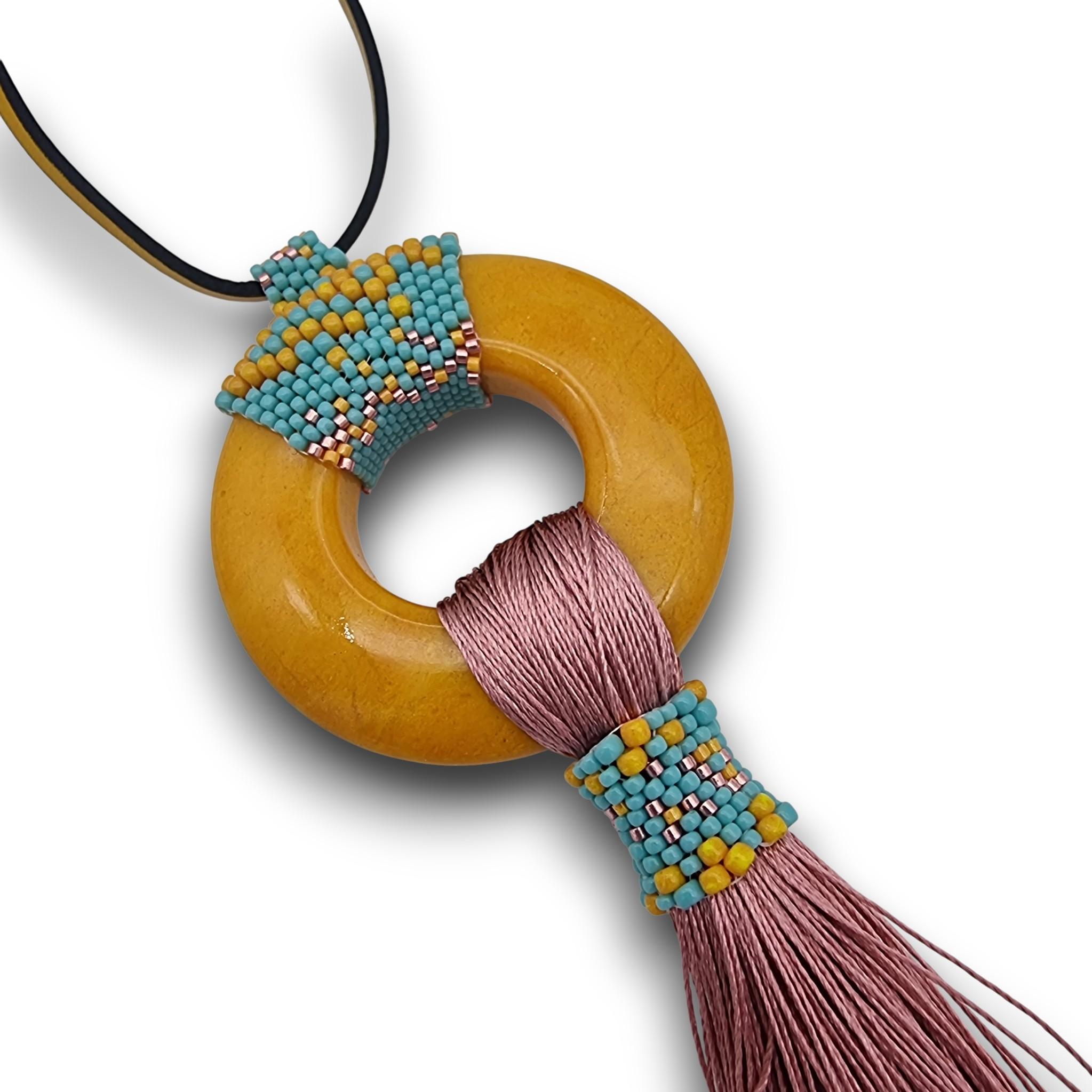 Adaugă o notă de căldură și rafinament ținutelor tale cu acest pandantiv statement, lucrat manual cu o deosebită atenție la detalii. Piesa centrală este un inel din alabastru, vopsit într-o nuanță solară de galben-ocru, ce emană o energie pozitivă.