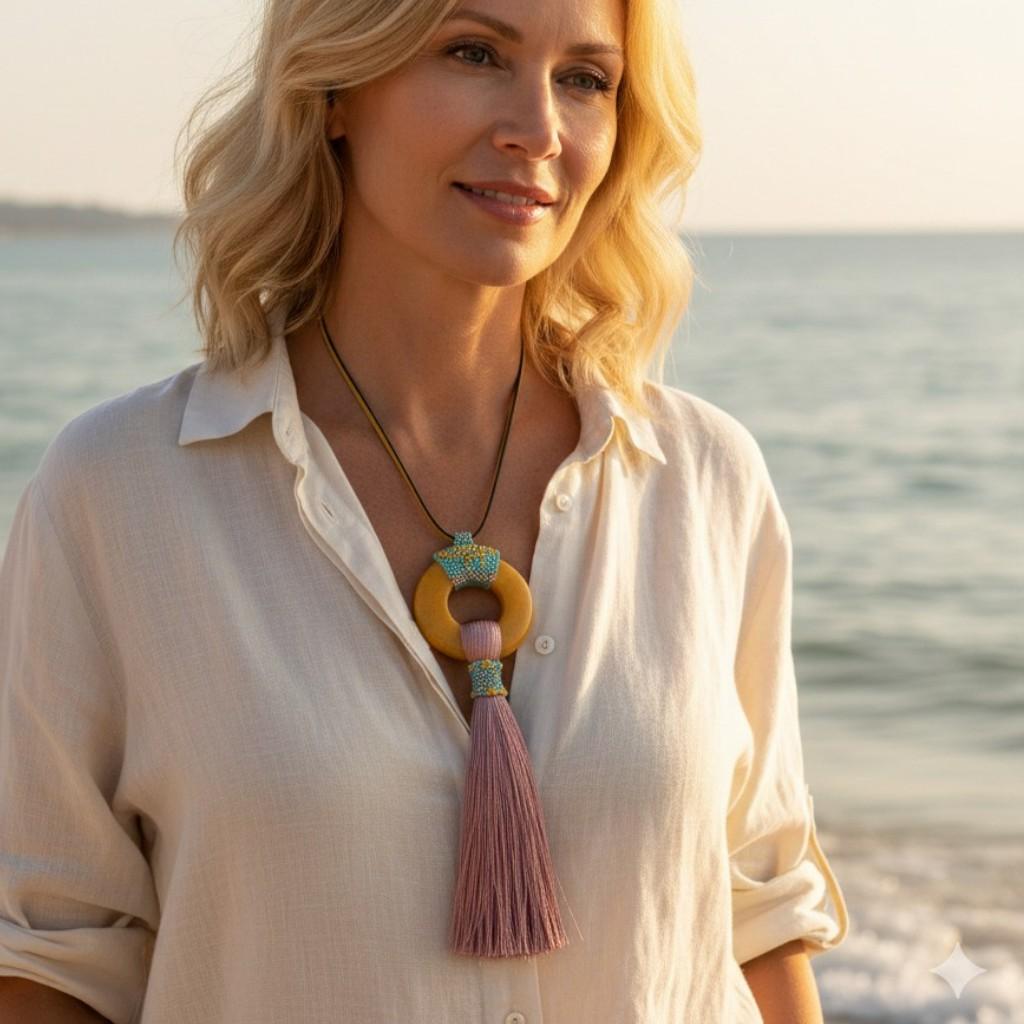 Designul este pus în valoare de tehnica Peyote circulară, aplicată atât pe anoul de prindere, cât și pe baza ciucurelui. Această tehnică complexă presupune adaptarea dimensiunii mărgelelor pentru a îmbrăca perfect formele curbate, rezultând o textură impecabilă. Ciucurele din fir mătăsos, în nuanța delicată de roz prăfuit, completează armonios paleta cromatică a colierului.