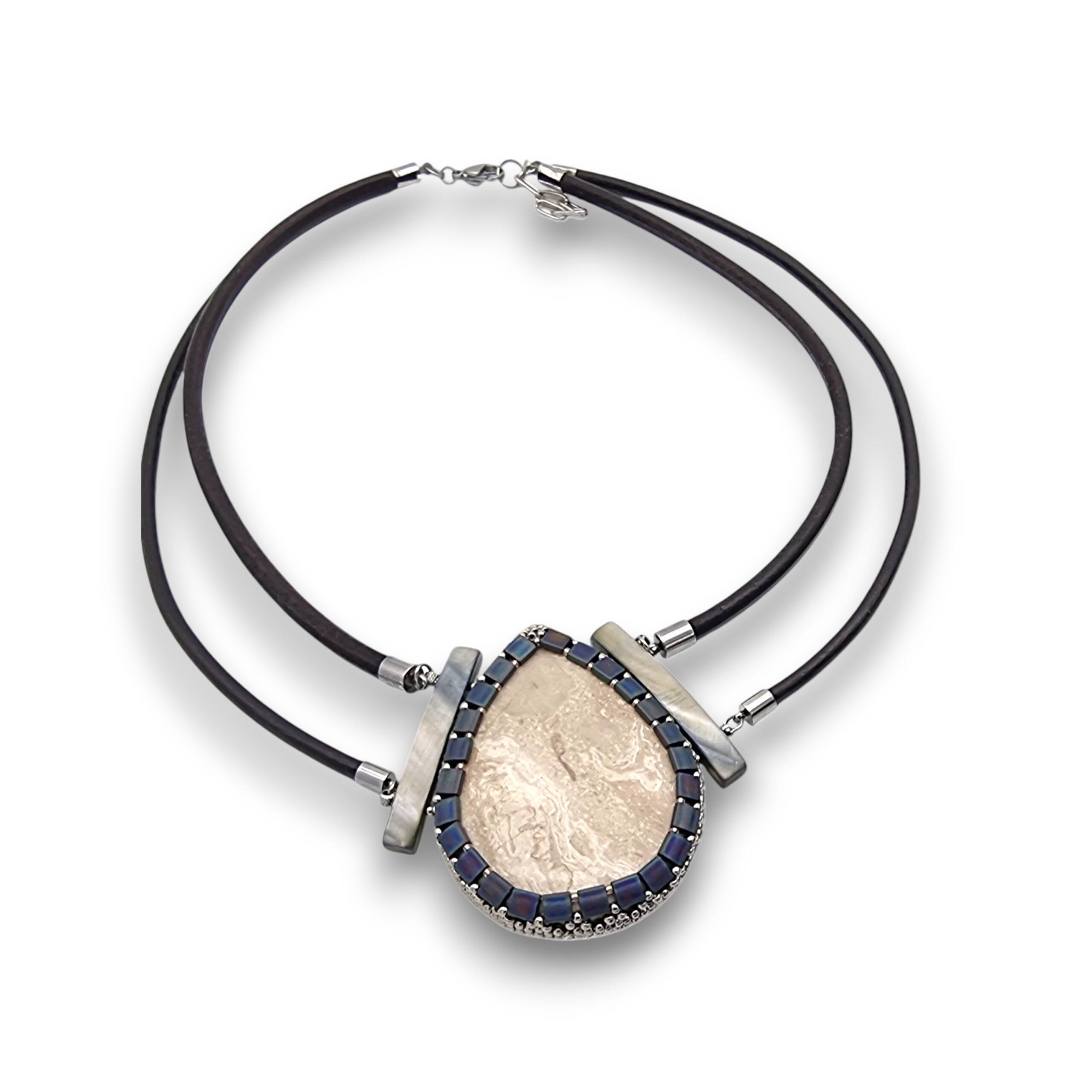 De țesătura Peyote sunt prinse lateral doua mărgele lungi din scoica, mari, de 40 x 5 x 3 mm, ca si la brățară. acetea sunt prevazute cu câte doua orificii, de care au fost prinse câte doua șnurur de piele de 4 mm diametru. Capetele de prindere, închizătoarea și lanțul prelungitor sunt din oțel inoxidabil.