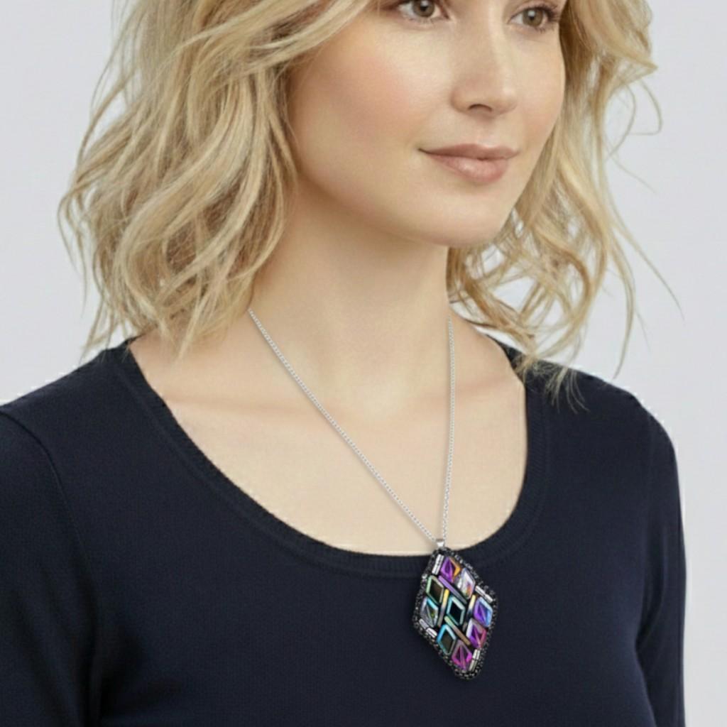 Descoperă o piesă de bijuterie care captează lumina și privirile: un pandantiv în formă de romb, lucrat integral manual, ce îmbină geometria modernă cu strălucirea hipnotică a materialelor electroplacate. Este accesoriul ideal pentru femeia care își dorește un look avangardist, dar sofisticat.