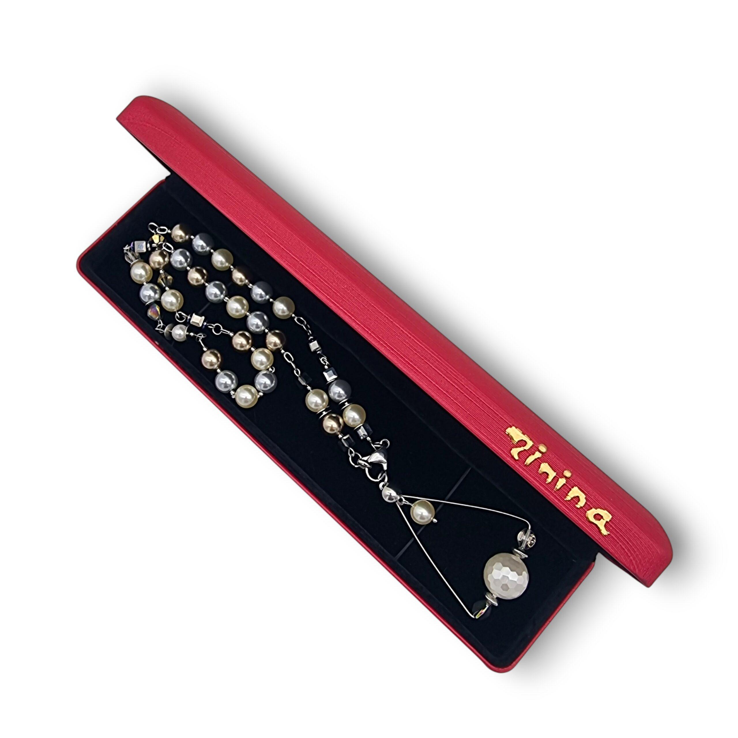 Compoziția cromatică echilibrează nuanțele perlate calde cu reflexele discrete ale cristalelor electroplacate, care captează lumina în tonuri fine de auriu, bronz și gri sidefat.