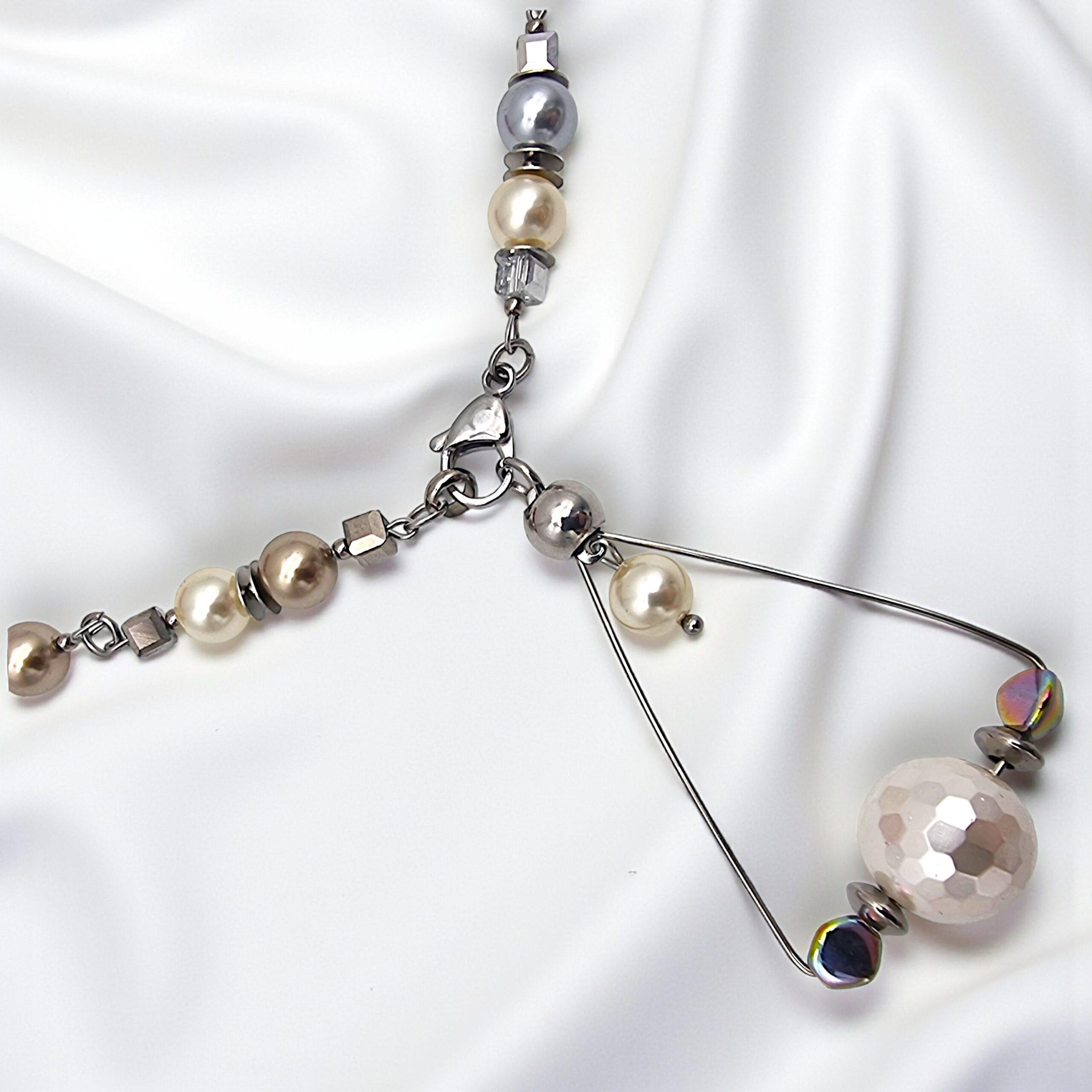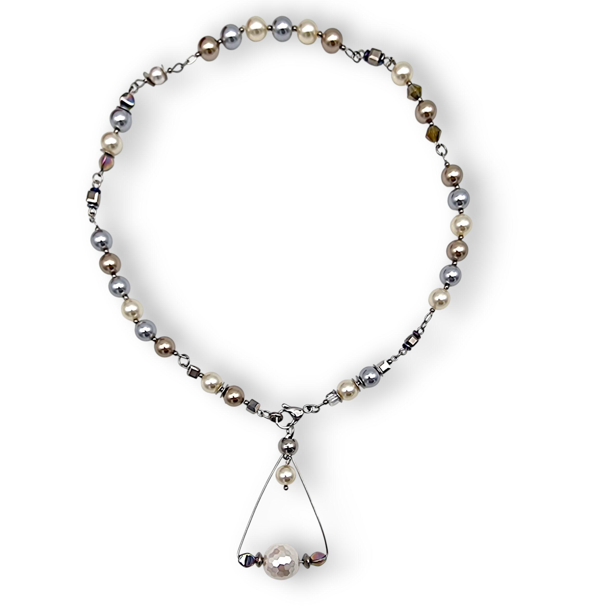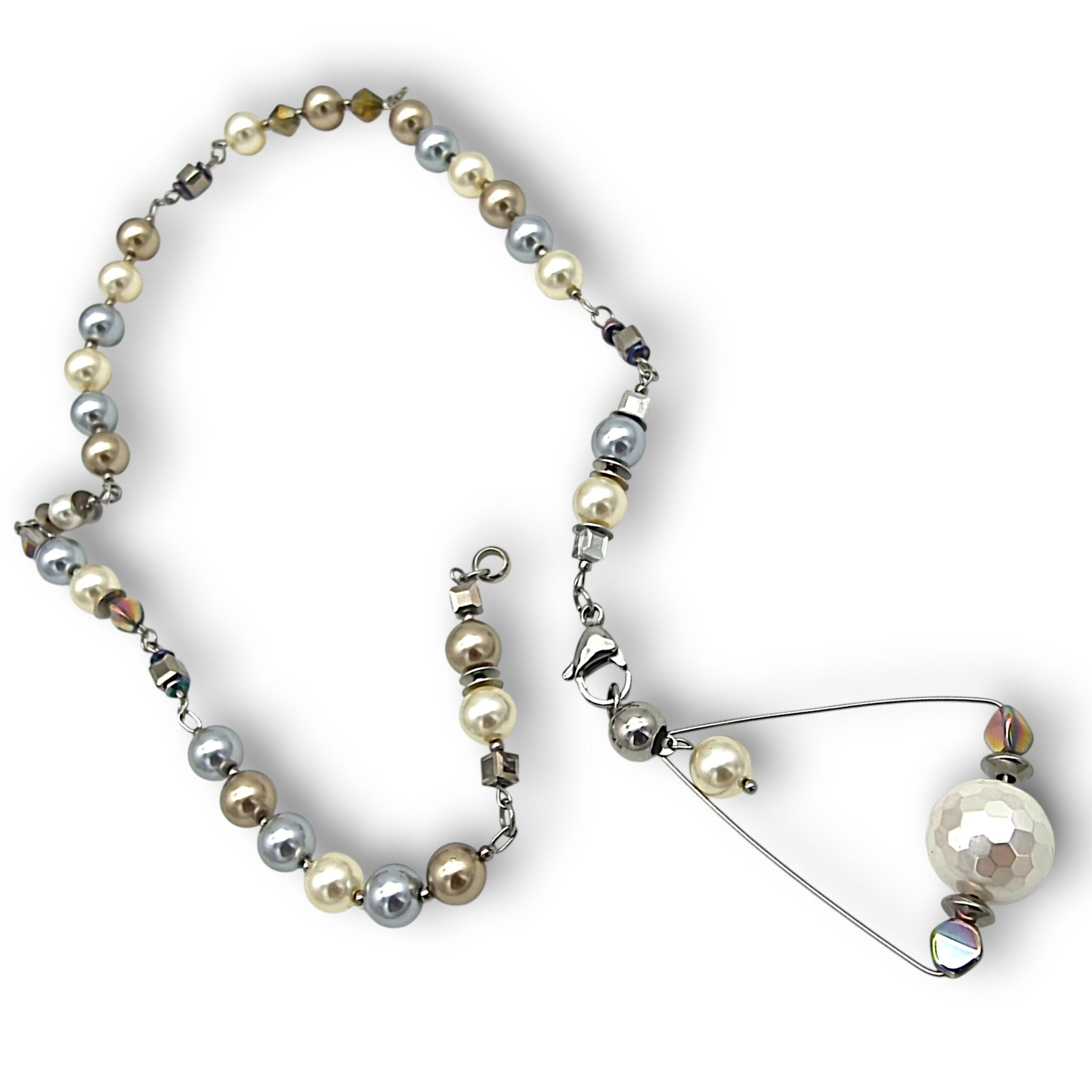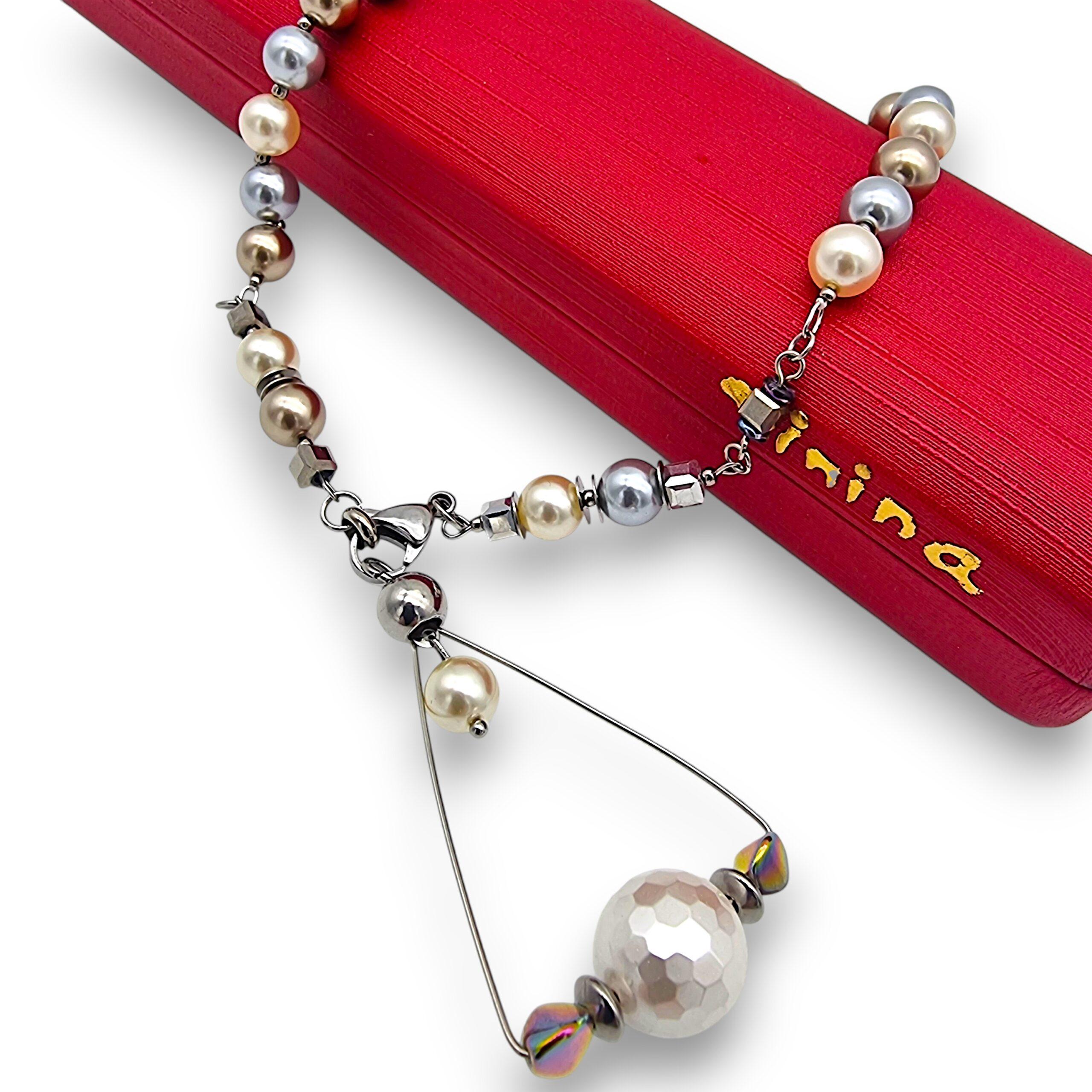 Acest colier este lucrat manual din perle tip Mallorca și cristale electroplacate de diverse forme și dimensiuni.