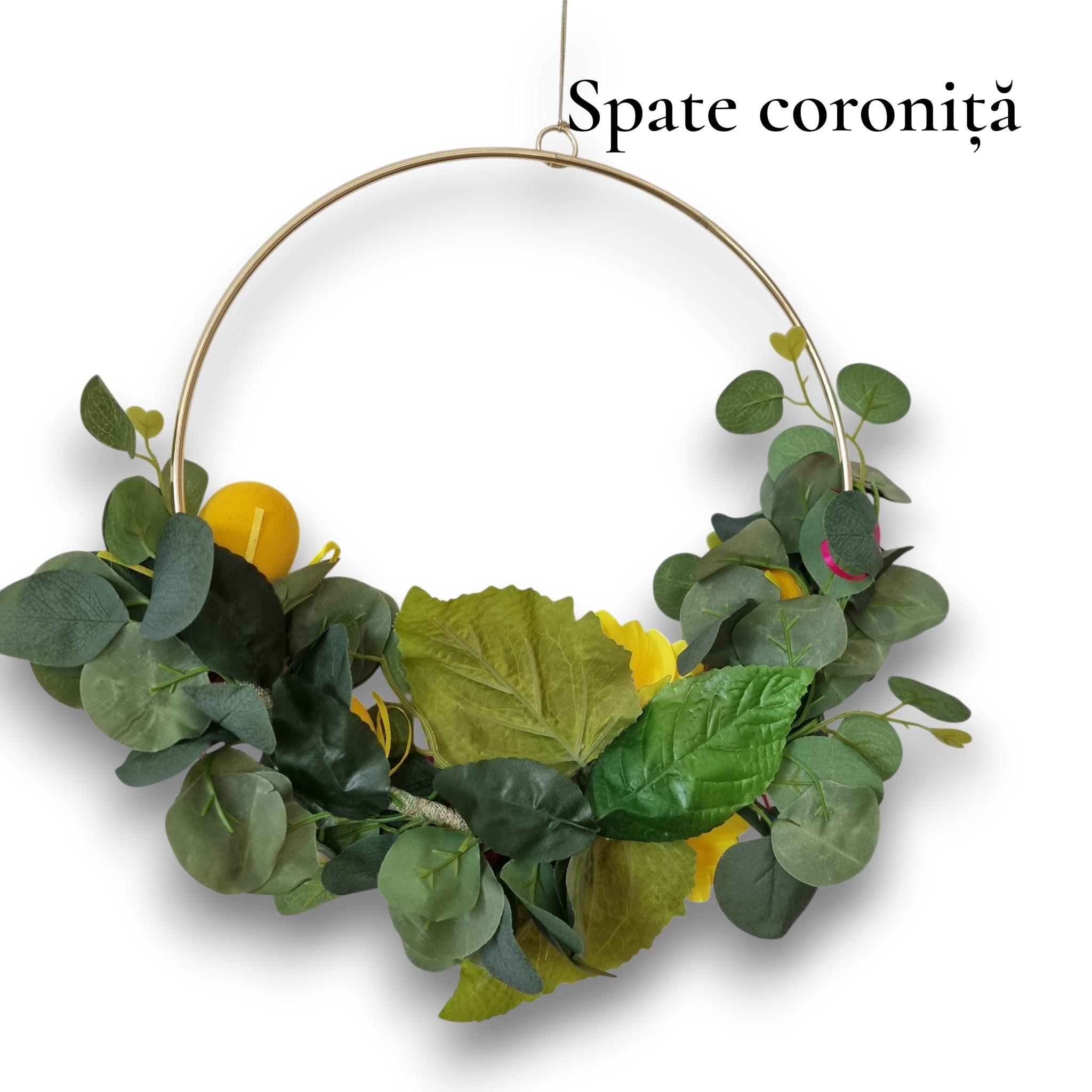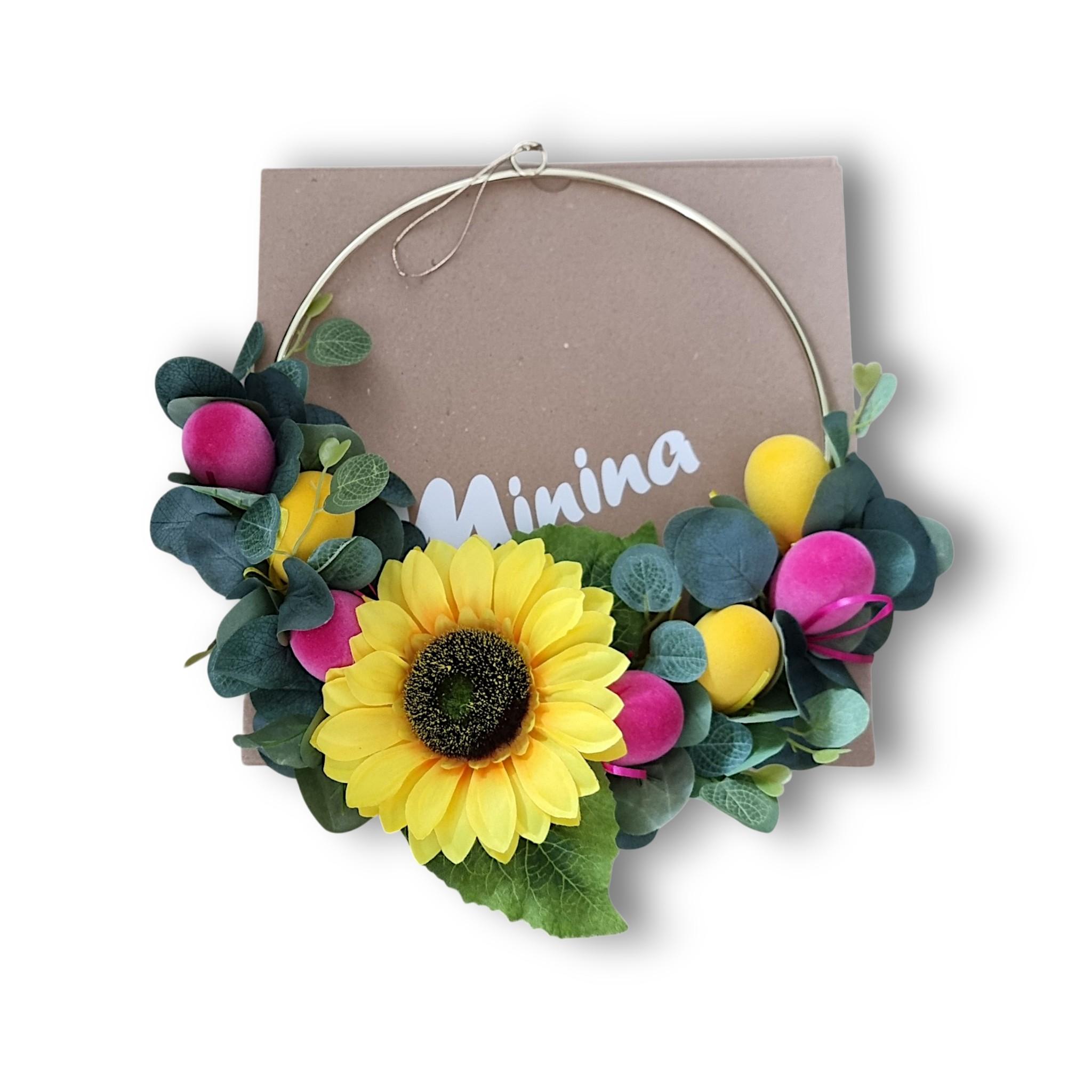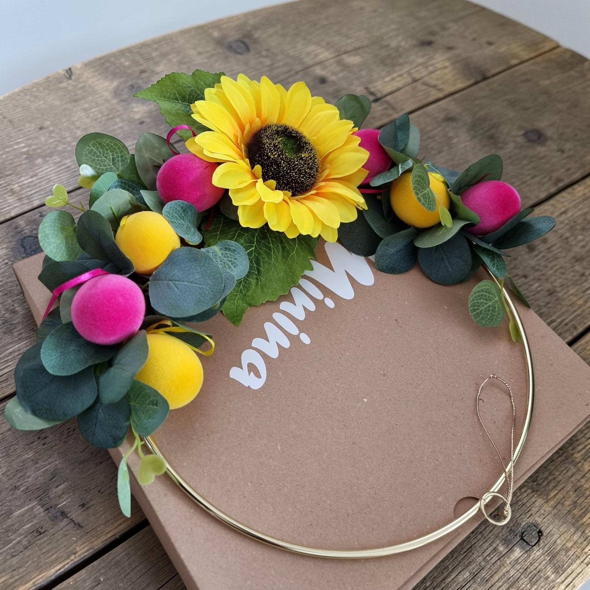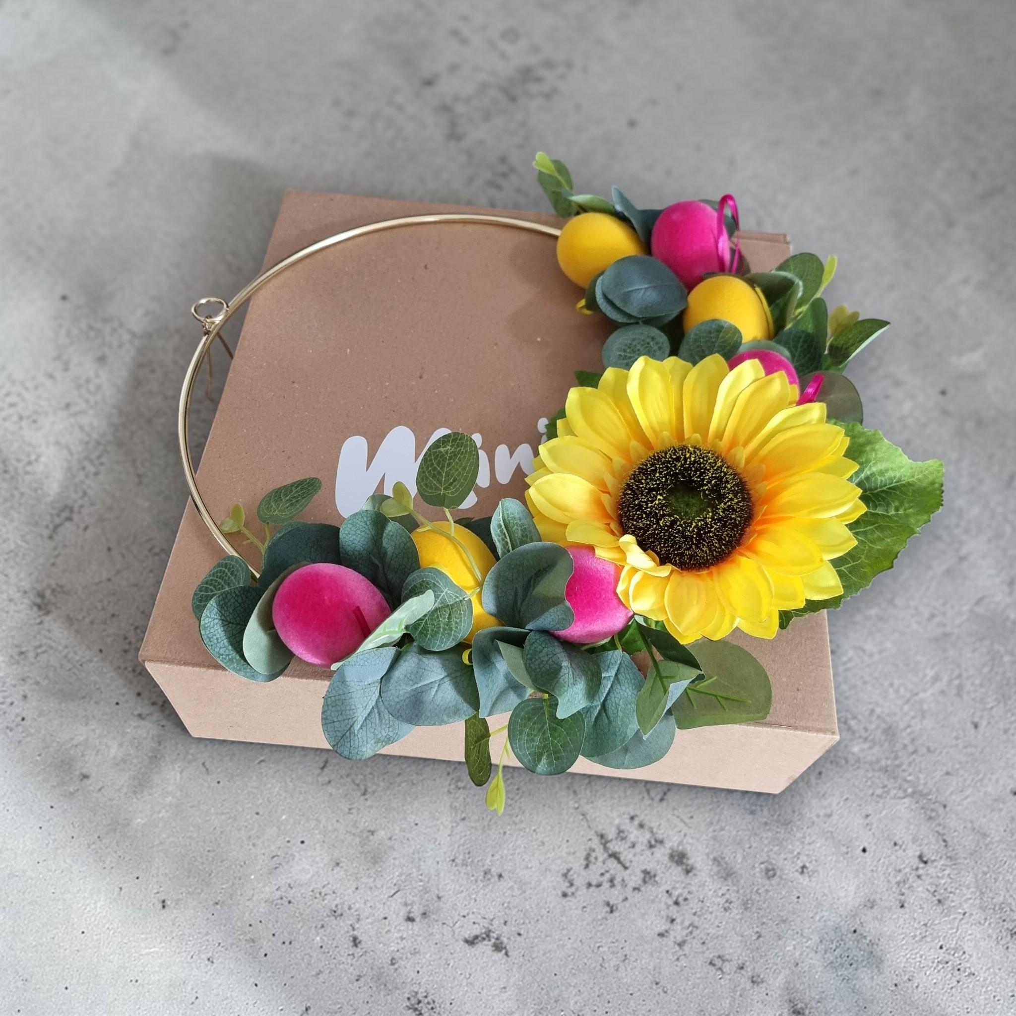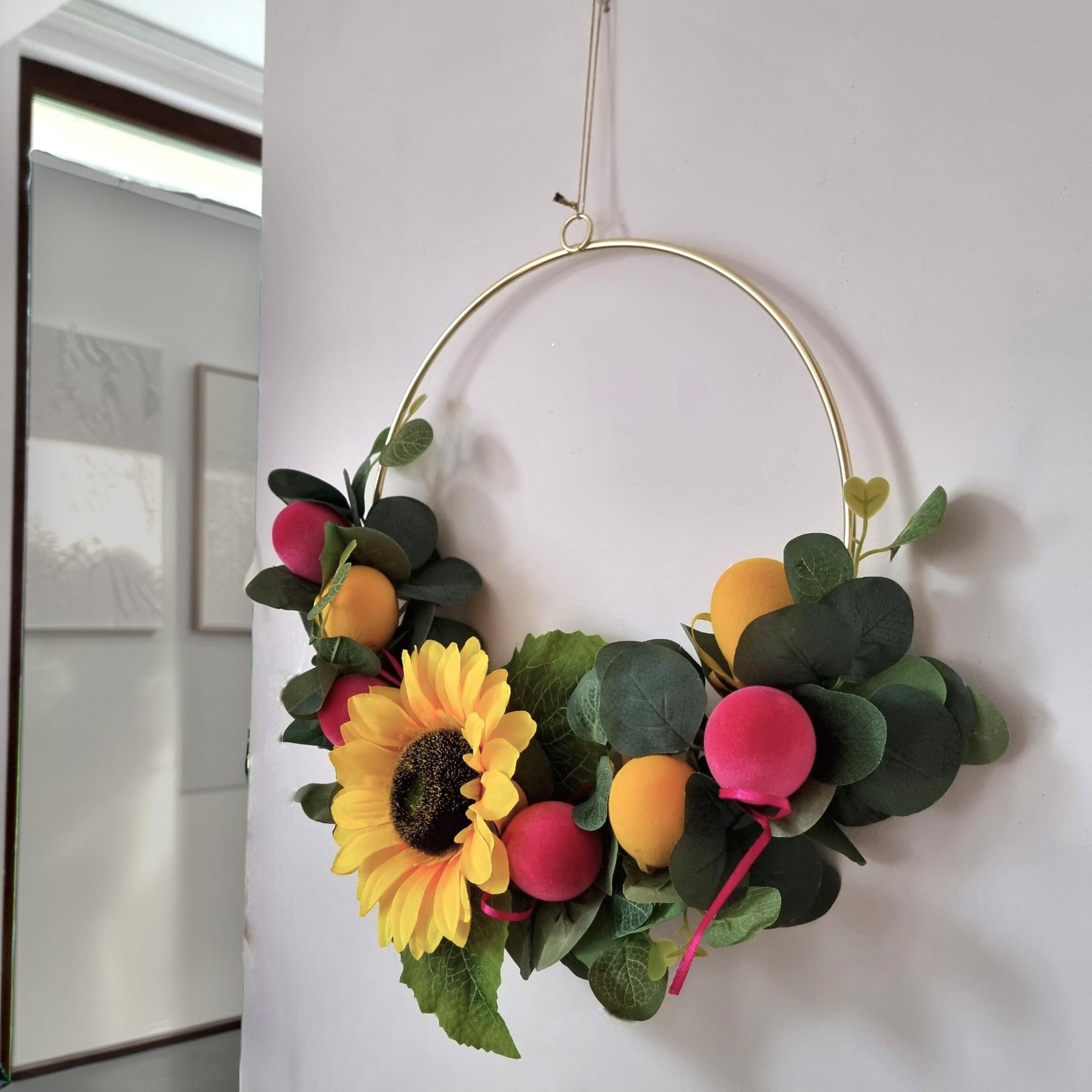 Această coroniță de Paște este o explozie de energie și culoare, concepută pentru a aduce un zâmbet pe buze oricui îți trece pragul. Designul modern se bazează pe un contrast cromatic puternic, îmbinând eleganța texturilor fine cu prospețimea elementelor florale.