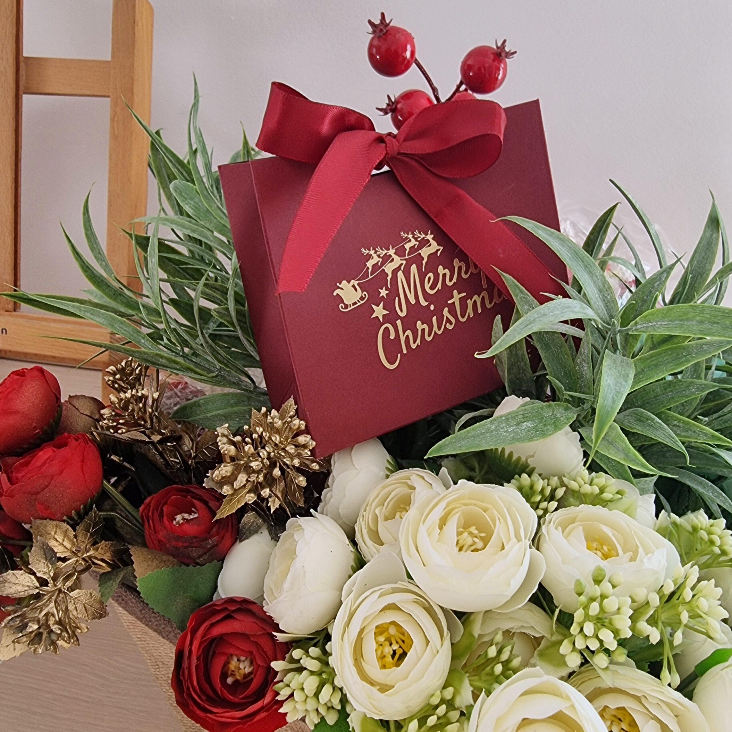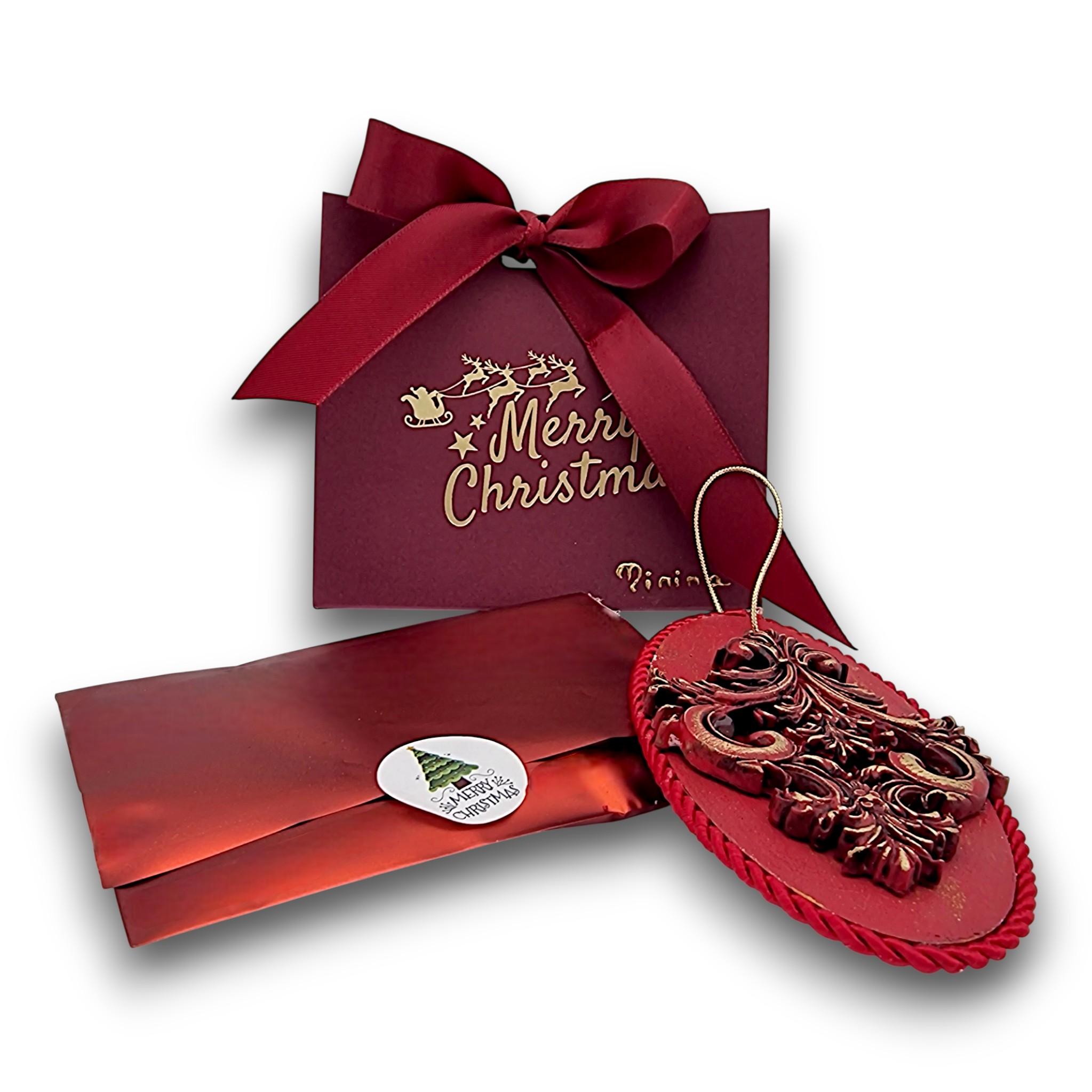 Ambalajul roșu metalizat și cutia cu fundă satinată completează perfect atmosfera de sărbătoare. Un detaliu discret, dar plin de semnificație – cadoul ideal pentru a spune „Crăciun fericit” cu eleganță.