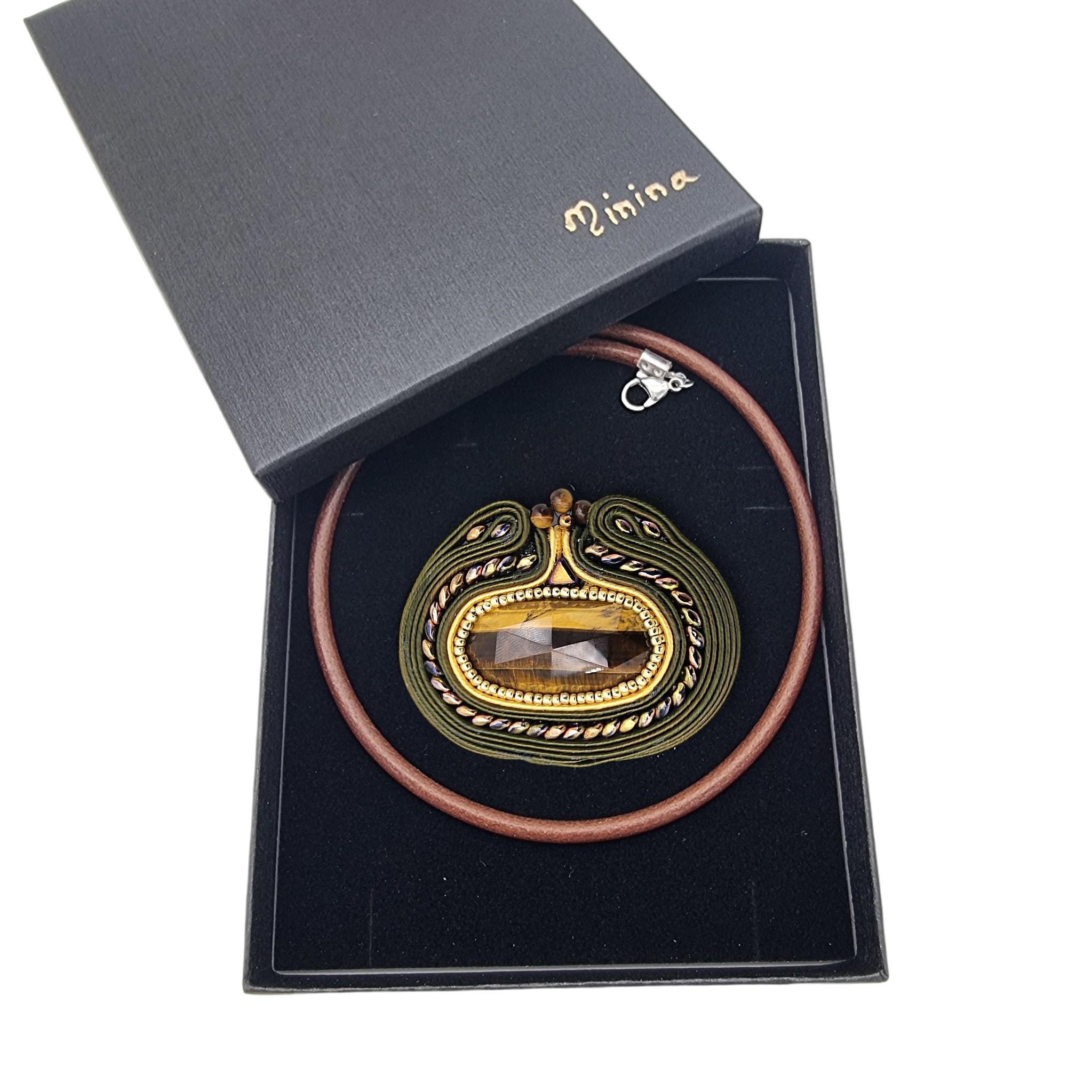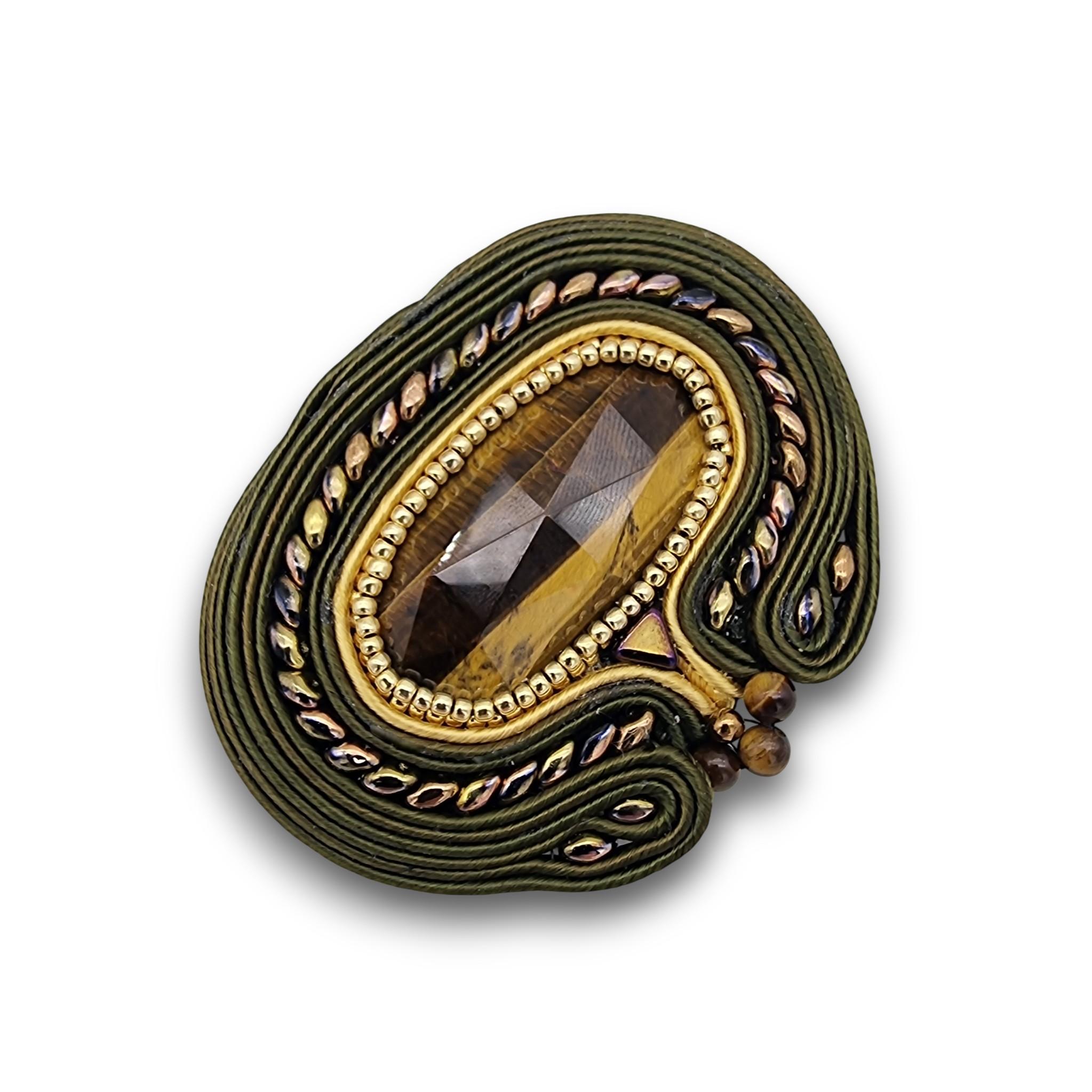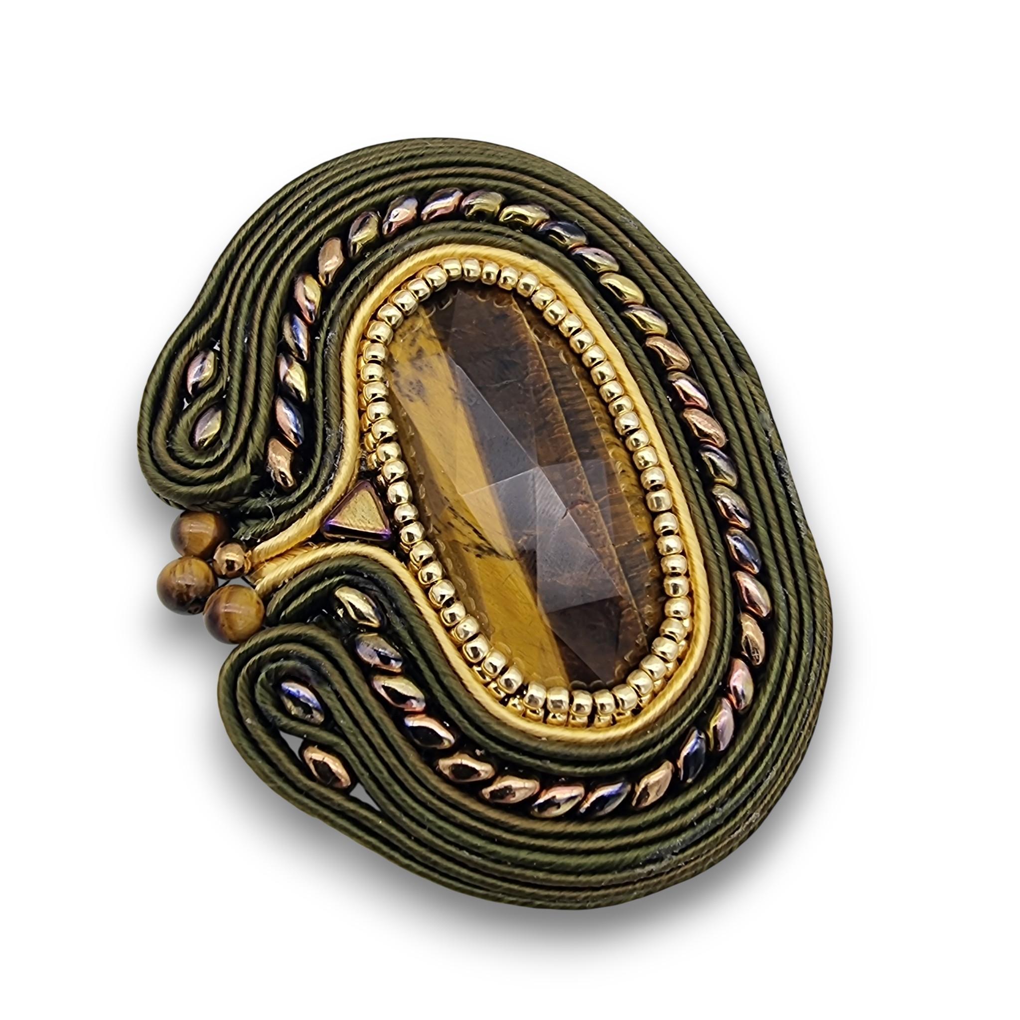 Design și Materiale: Piatra este îmbrățișată de o broderie minuțioasă realizată manual prin tehnica soutache, utilizând șnururi de mătase în tonuri de verde oliv și auriu. Detaliile sunt accentuate de mărgele din sticlă de Cehia, într-o nuanță de auriu vintage cu reflexii subtile de curcubeu.