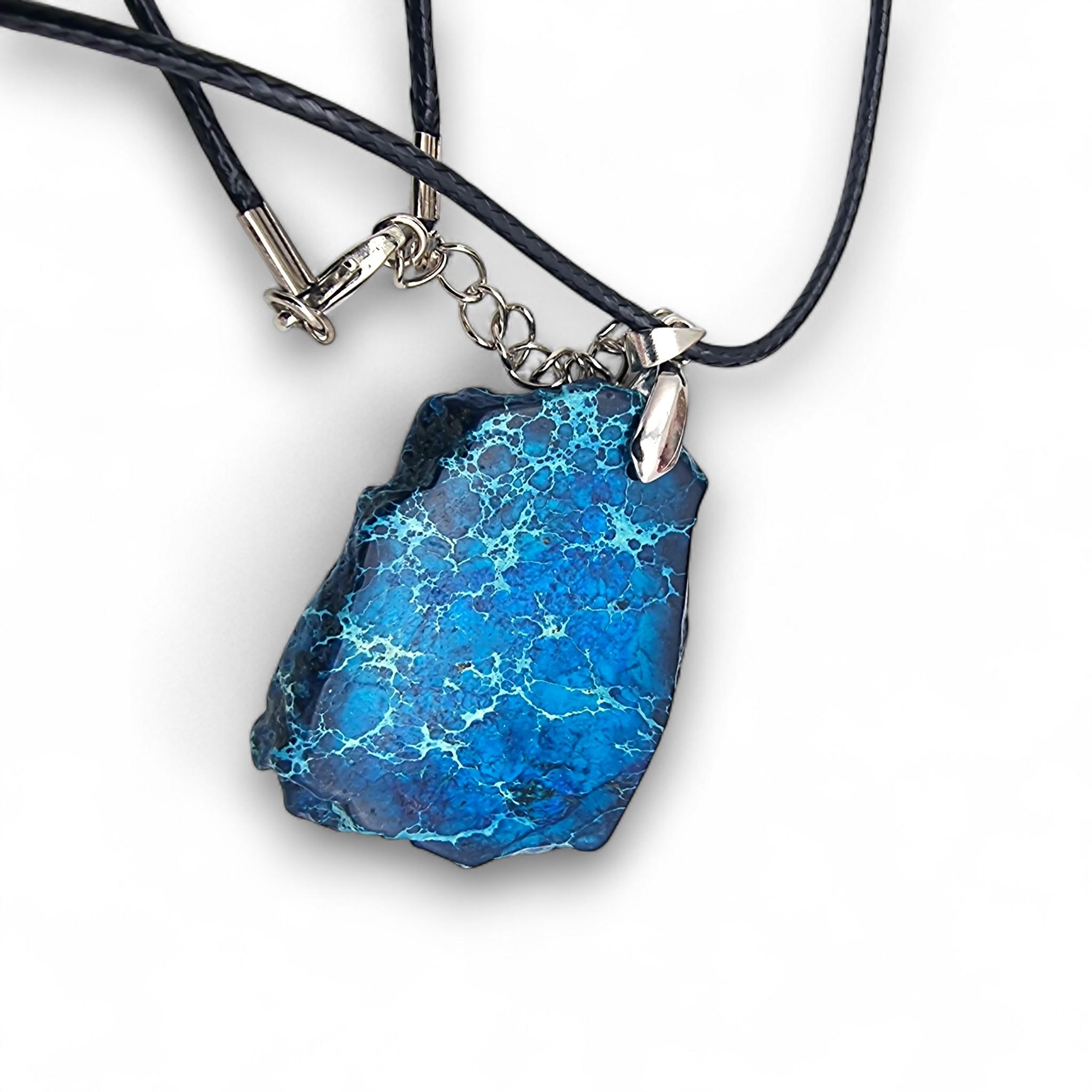 Colier cu pandantiv Regalit neuniform, dimensiuni aproximative 43×38 mm. Bază colier din șnur cerat negru. accesorii metalice inox.