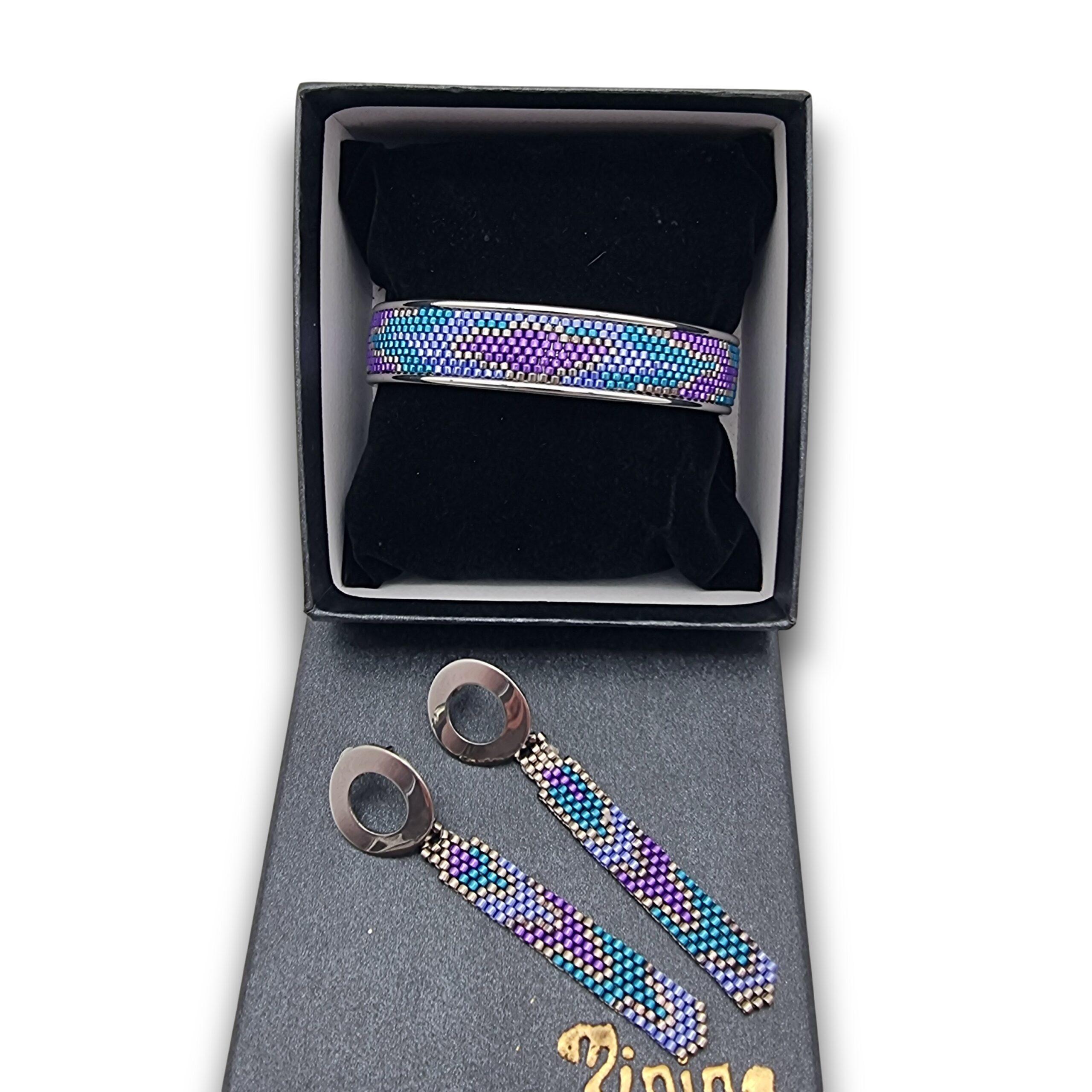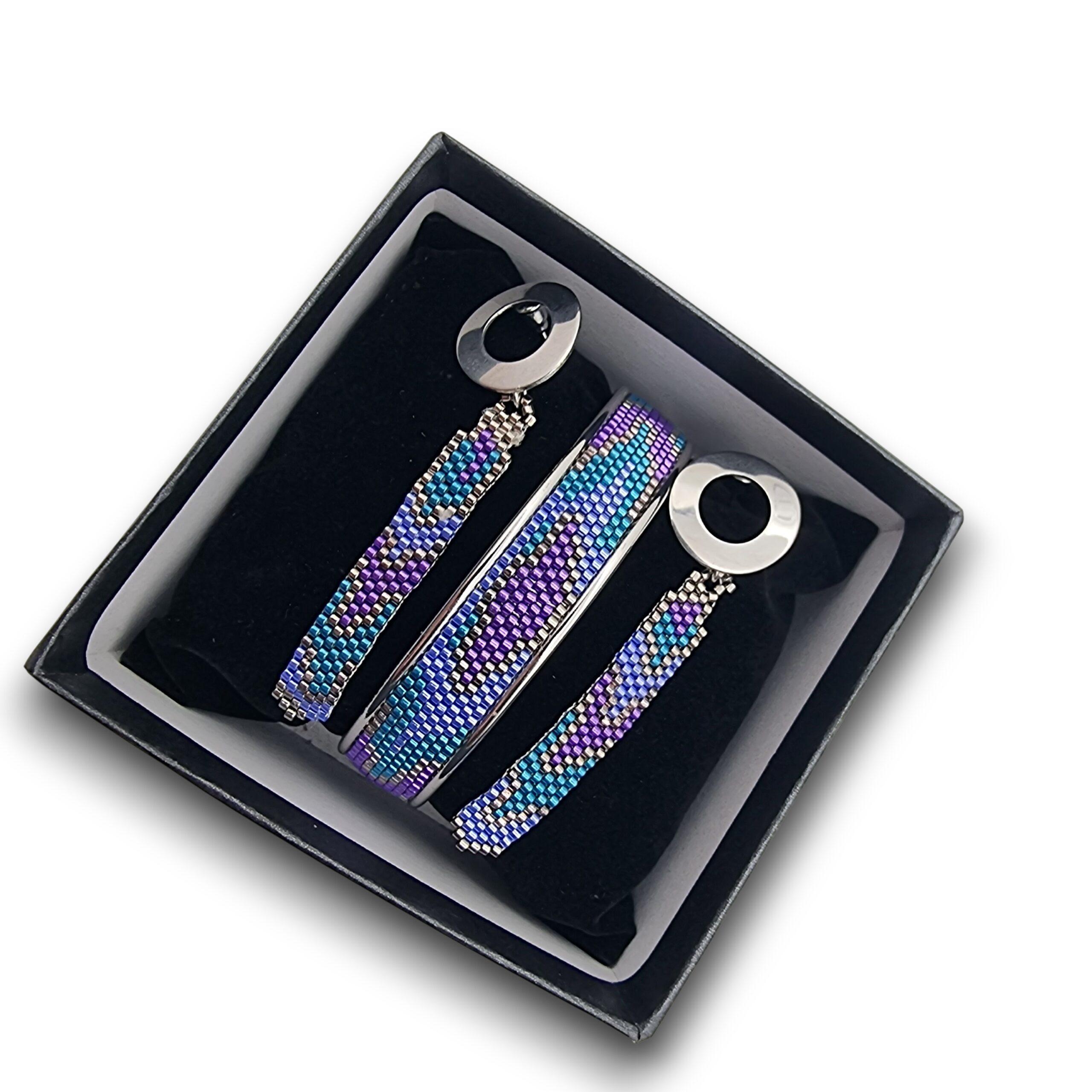 Adaugă o pată de culoare și rafinament ținutei tale cu acest set unicat, creat cu multă răbdare și atenție la detalii. Combinația de mov, albastru și reflexii metalice amintește de culorile cerului la apus, fiind accesoriul perfect pentru momentele în care vrei să te simți specială.