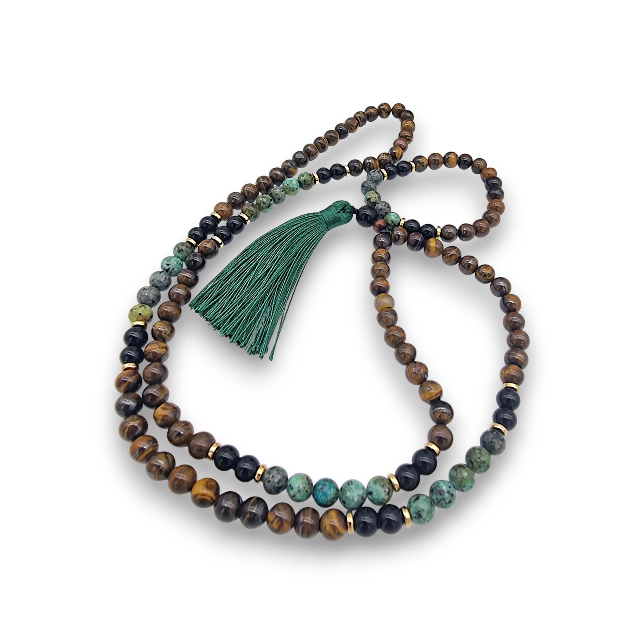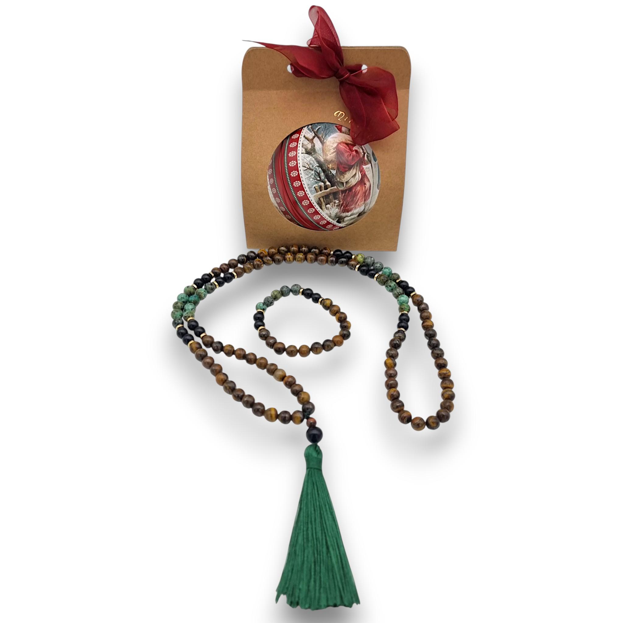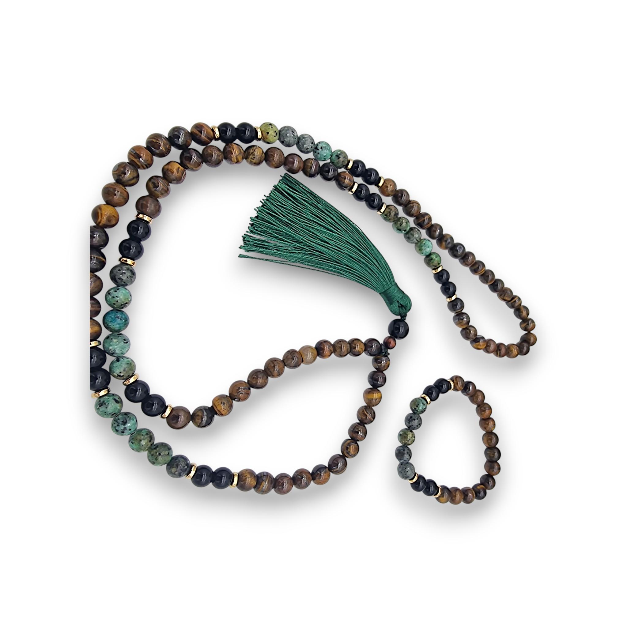 Ambele piese pot fi realizate din lemn de santal, semințe de rudraksha, pietre semiprețioase, cristale sau perle – fiecare material având propria vibrație și simbol. Setul Mala devine astfel un talisman elegant și spiritual, care aduce liniște, claritate și un strop de sacralitate în viața de zi cu zi.